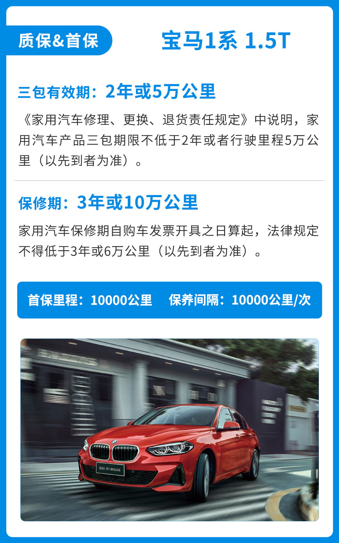 1系的首保时间为10000公里或一年,这一点以先到先得为准,而保养周期也是10000公里一次,在保养周期上是和A3一致的。不过要说的是,宝马全系车型都不提供免费首保的。