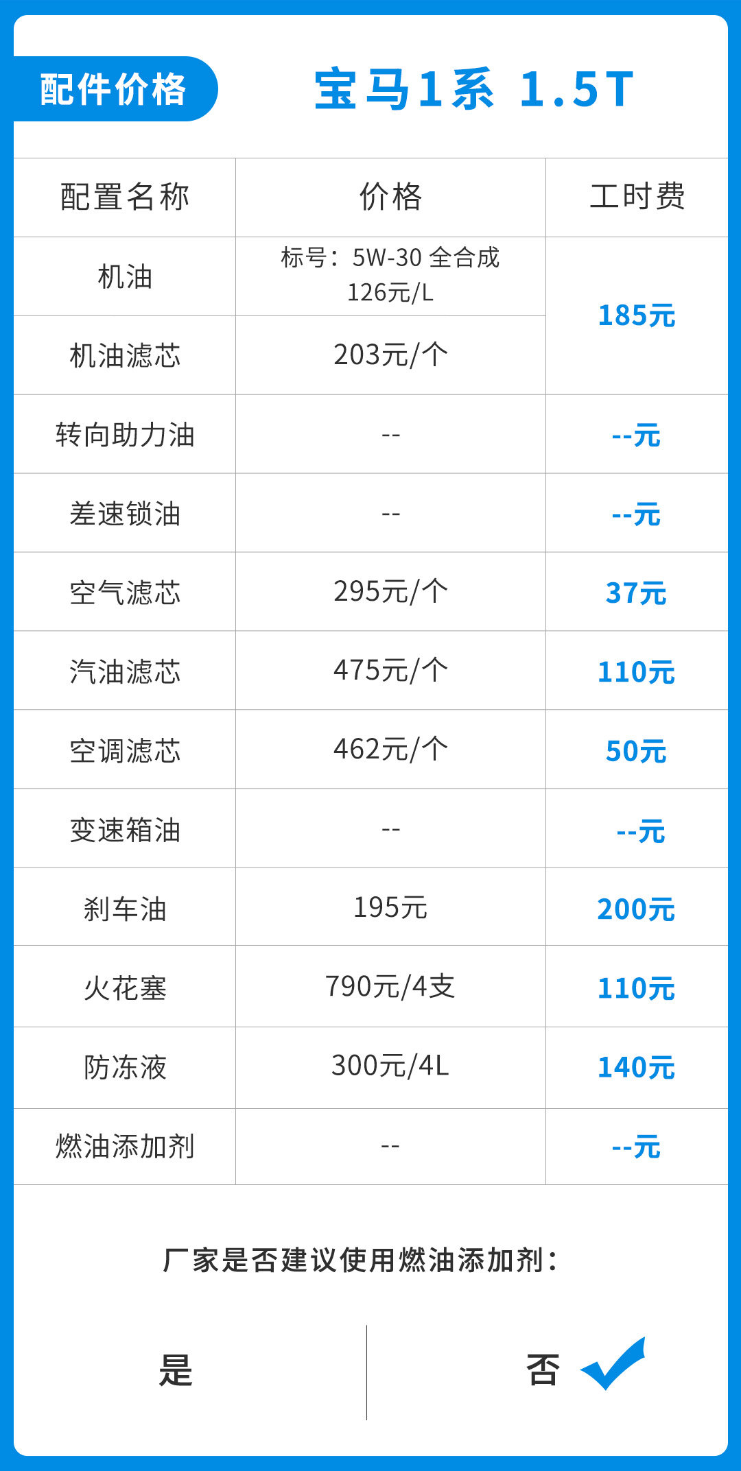 在配件表上,整体没有给人一种惊喜或者惊吓的感觉,也就是正常豪华品牌的收费标准,并没有因为是入门车型而有太大出入。至于如果和A3相比的话,1系主要是配件贵,而A3则是工时费贵,综合算下来都没差多少。
