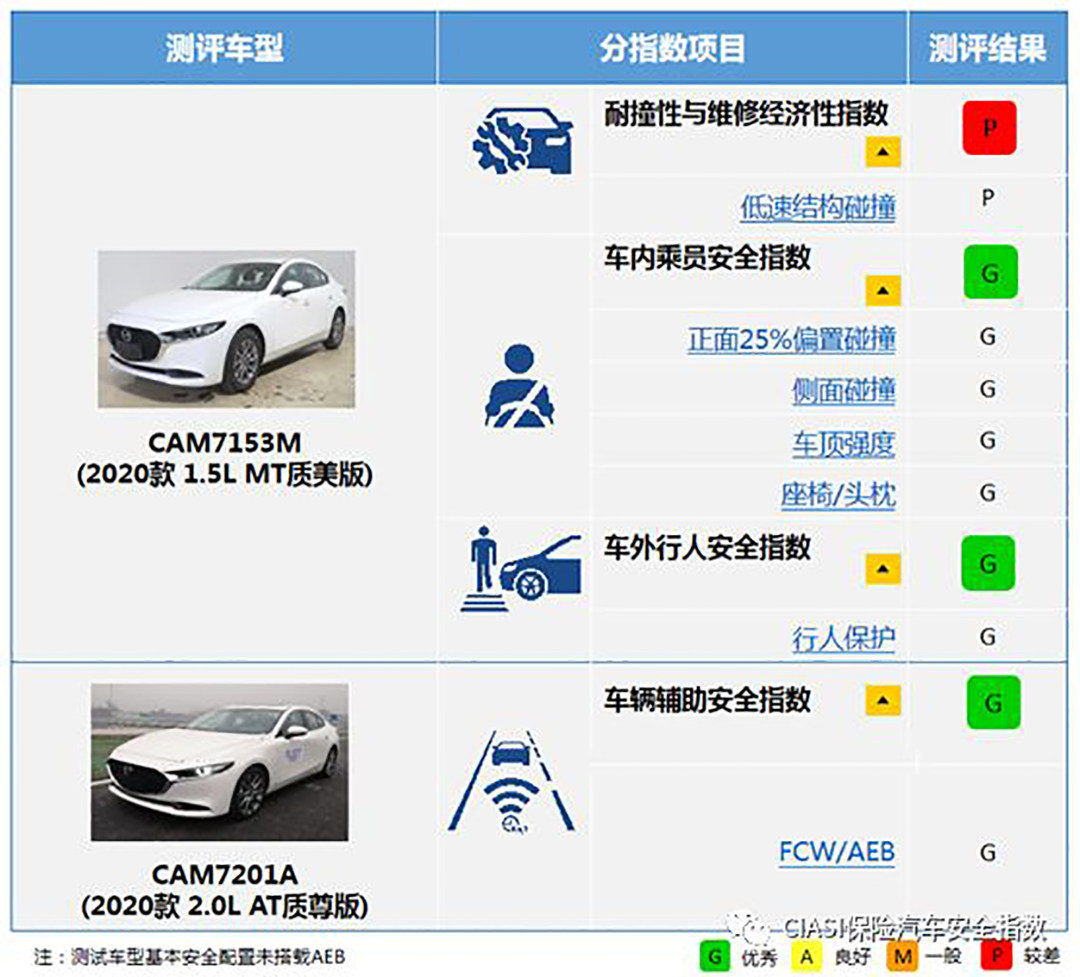 日前,中国保险汽车安全指数管理中心(C-IASI)公布了长安马自达3(2020款 1.5L MT质美版)碰撞成绩。测试结果显示,马自达3在耐撞性及维修经济性指数方面得到较差(P)评价,在车内乘员安全指数方面(正面25%偏置碰撞、侧面碰撞、车顶强度和座椅/头枕测评)、在车外行人安全指数方面、在车辆辅助安全指数方面均获得优秀(G)评价。