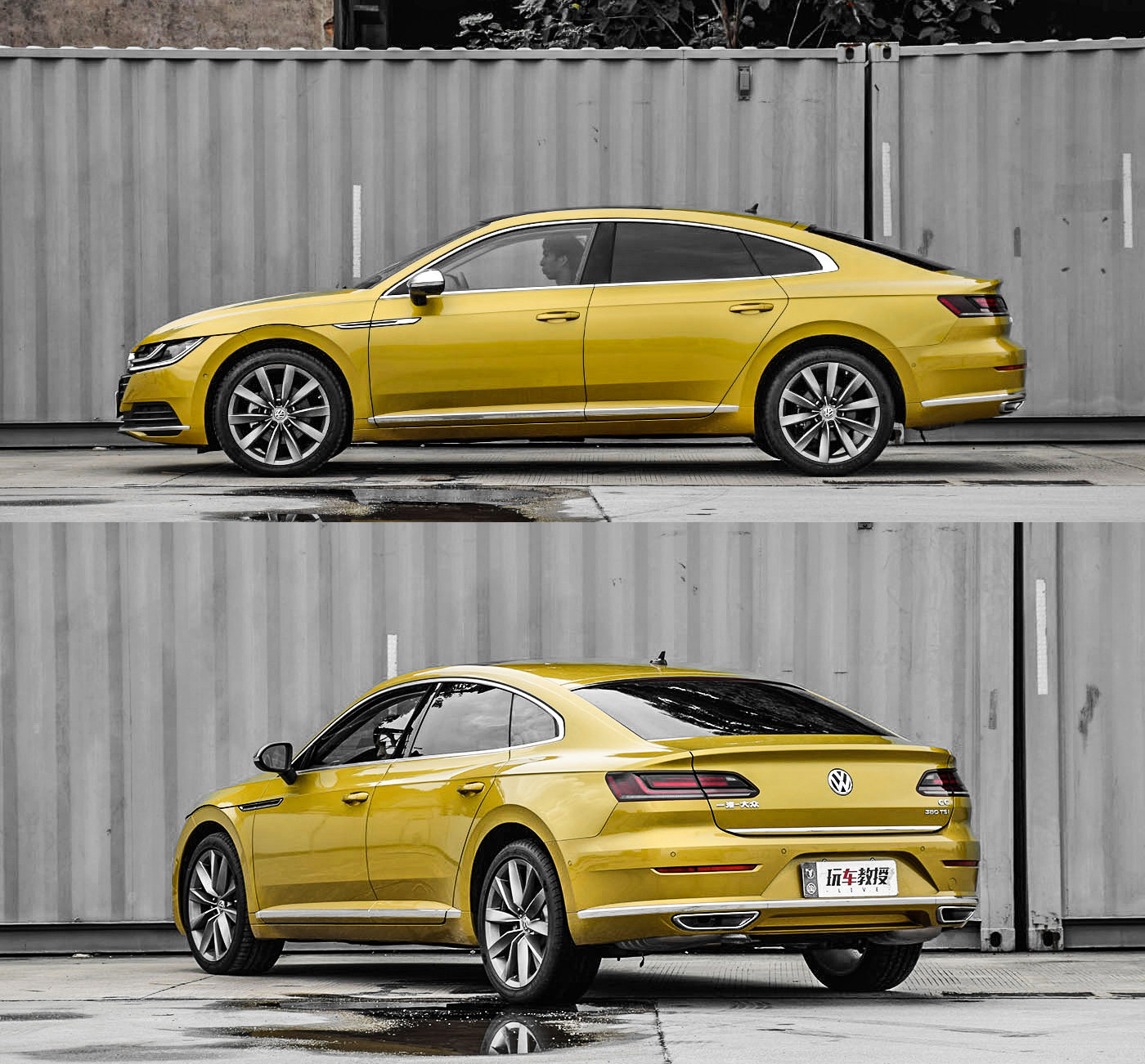 而大众CC的Fastback造型则相对彻底一点,尾部的线条来到了末端,还有翘起的小尾翼,视觉重心在上方,车身侧面的腰线不像雅阁那么突出,相对精简,是典型的德系设计风格。