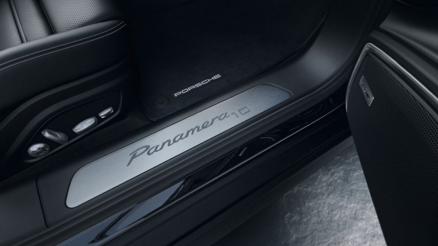 内饰方面,其10周年纪念版车型在细节上的处理处理上十分有心思。其主要的细节变化集中在副驾驶装饰面板和迎宾踏板处配备了“Panamera10”十周年纪念标识,同时采用了黑色真皮搭配白金色缝线。