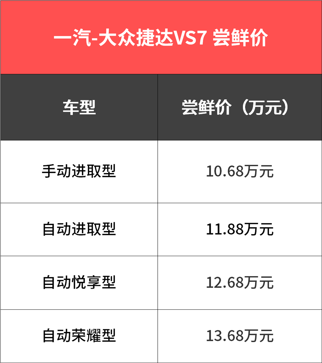 3月20日,一汽-大众捷达宣布旗下第三款车型——捷达VS7正式上市。新车售价区间为10.68-13.68万元,限时会员抢先价10.48-13.38万元,共推出4款车型。此次公布的正式售价与此前的“尝鲜价”保持一致。新车基于MQB平台打造,尺寸为4624*1841*1633(1644)mm,轴距为2730mm。动力方面,新车搭载1.4T涡轮增压发动机,匹配5MT或6AT变速箱。这样的售价对于一款拥有大众血统的SUV而言,无疑是十分具有吸引力的。