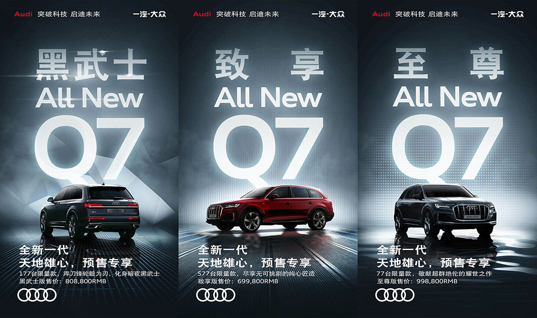日前,奥迪官方公布了新款奥迪Q7限量版车型的售价,此次共推出3款车型,分别为577台的2.0T 致享版、177台的3.0T 黑武士版以及77台的3.0T 至尊版。作为奥迪Q7的中期车型,新车换装上全新家族化的八边形中网和内饰设计,整体视觉效果和内饰氛围得到不少提升。此次推出为限量版车型,与最终上市车型的售价会有所不同。正所谓“早买早享受,晚买有折扣”,如果有意购车奥迪Q7的消费者不妨先观望一下,毕竟优惠过后的Q7会更“香”。