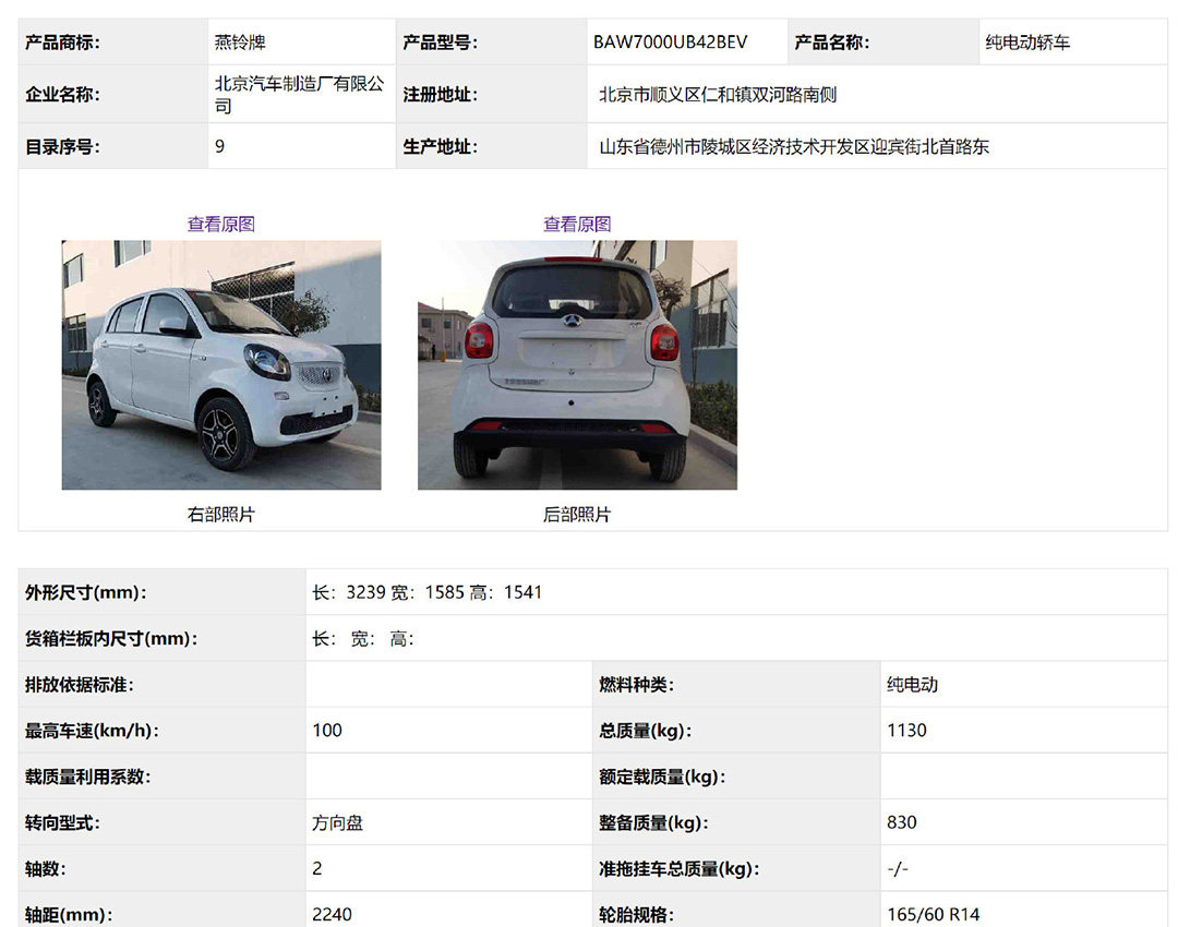 日前,北京汽车制造厂燕玲大猫申报图在工信部公布。公开资料显示,新车长宽高分别为3239/1585/1541mm,轴距为2240mm,轮胎尺寸为165/60 R14。新车将搭载代号为TZ160XK41YQ的电动机,额定功率10kW,峰值功率为20kW,最高时速为100km/h。新车定位A00级别纯电动轿车,不难看出新车主攻三四线城市,续航里程方面预计会在250km之上,能够享受国家新能源政策补贴。