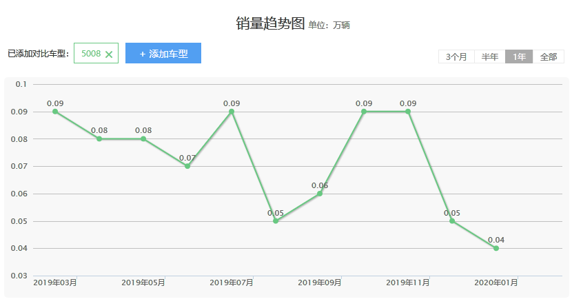 买买君统计了一下标致5008最近一年的销量,2019年5008的销量为9372台。从上图中也可以看得出来,月销量从来没有超过1000,而在一月份更是沦落到只有358台的地步。