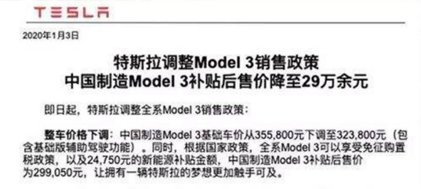 今年元旦一过,特斯拉就给广大潜在消费者送来了大礼包,从1月3日起,国产Model 3整车价格下调,标准续航升级版价格由原来的35.38万下调到32.38万元,同时享有2.475万元的新能源补贴和免购置税的政策,补贴后的售价“仅”为29.905万。听到这个消息后,特斯拉的粉丝狂欢了,“跪舔”了,Model 3的销量在2月份一下子飙到了轿车排行榜第5位,甚至把卡罗拉、雅阁、桑塔纳都甩在了身后。