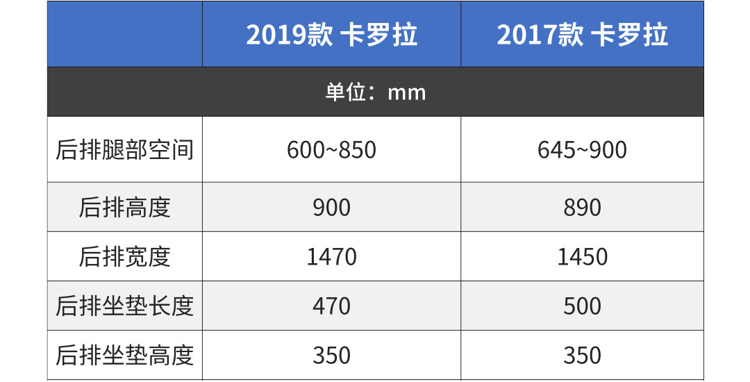 如果你试过现款卡罗拉与上一代卡罗拉,你会明显感觉后排的乘坐空间缩水了。虽然现款轴距与上一代车型均维持在2700mm,但后悬架却由扭力梁式非独立悬架,换为了多连杆式独立悬架,由于悬架结构问题,现款车型不得不牺牲一定乘坐空间。对比上一代卡罗拉645~900mm的腿部空间,现款车型后排腿部空间为600~850mm,确实有所降低。体验过后现款车型的后排空间虽然依旧够用,但也仅仅是够用而已,却不及上一代车型那么宽敞了。