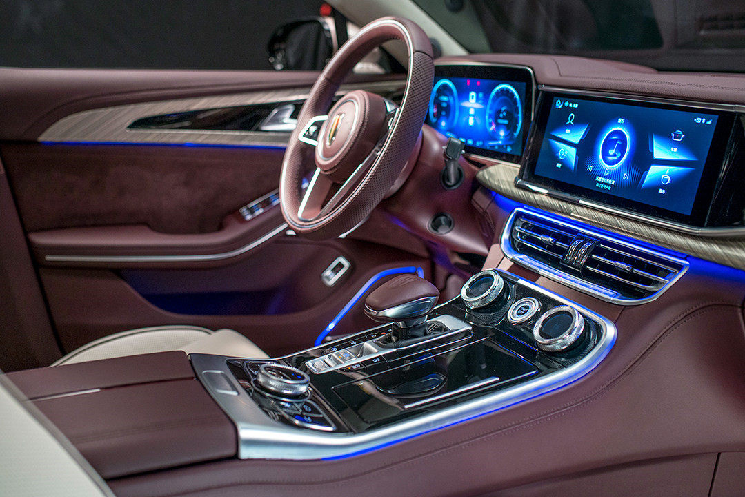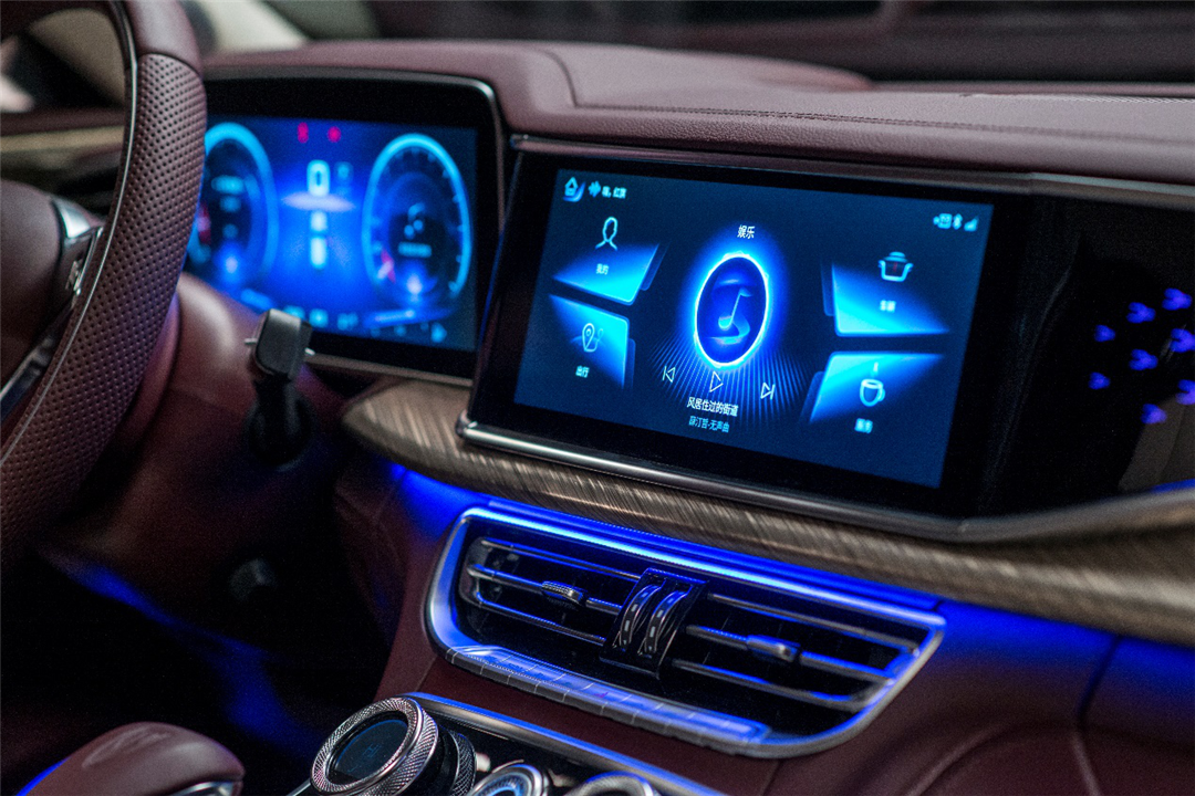 全舱环绕的中轴布局,经由若隐若现、虚实相生的活跃着生命律动的山水纹理画卷,还原音乐本真的虚拟环绕音响系统和音源修复技术、以及梦幻千色的氛围灯光和中草药香、木质香、草系香、琥珀香调配而成的能使人心旷神怡的香薰系统点缀,从视觉入心,从听觉入耳,从嗅觉入鼻,为乘员提供全方位尊崇用车体验。
