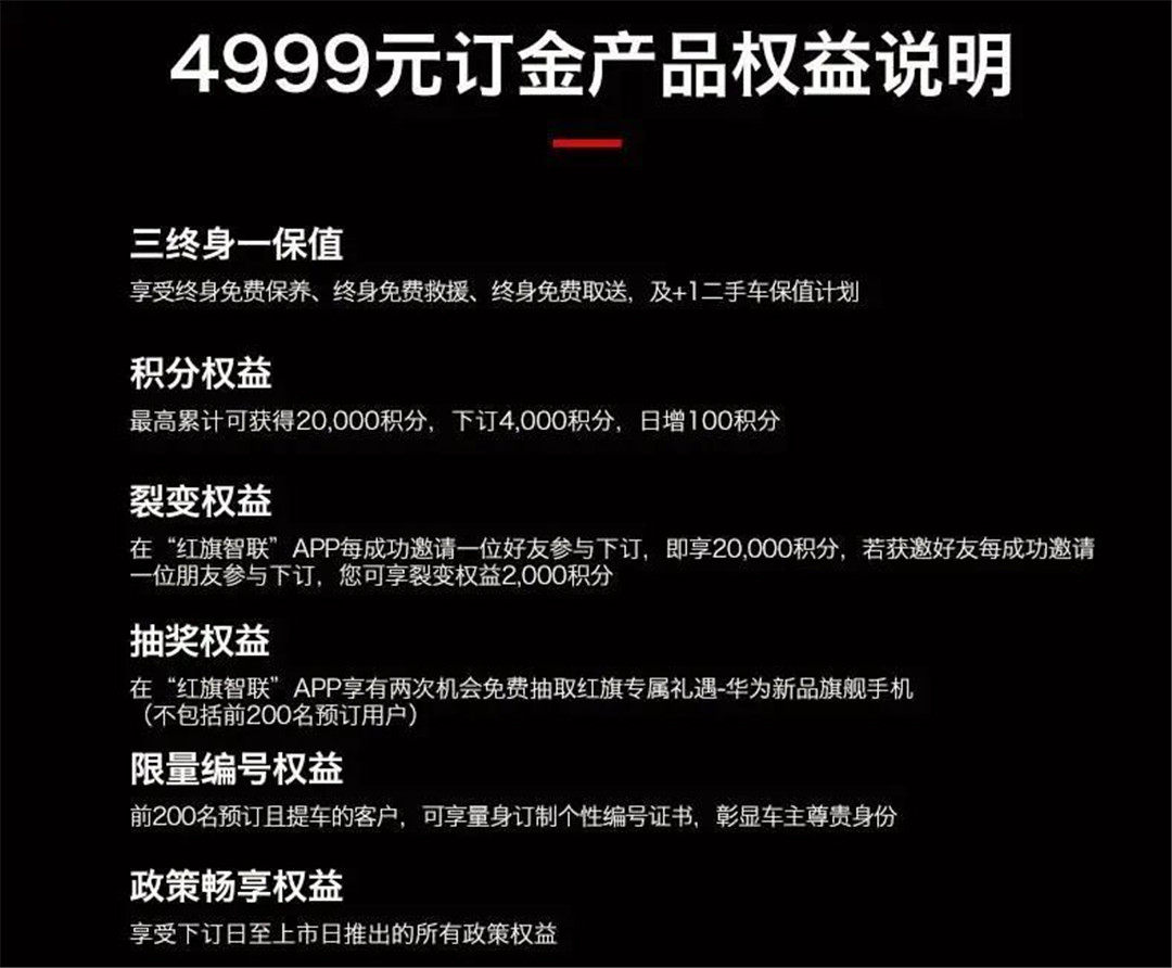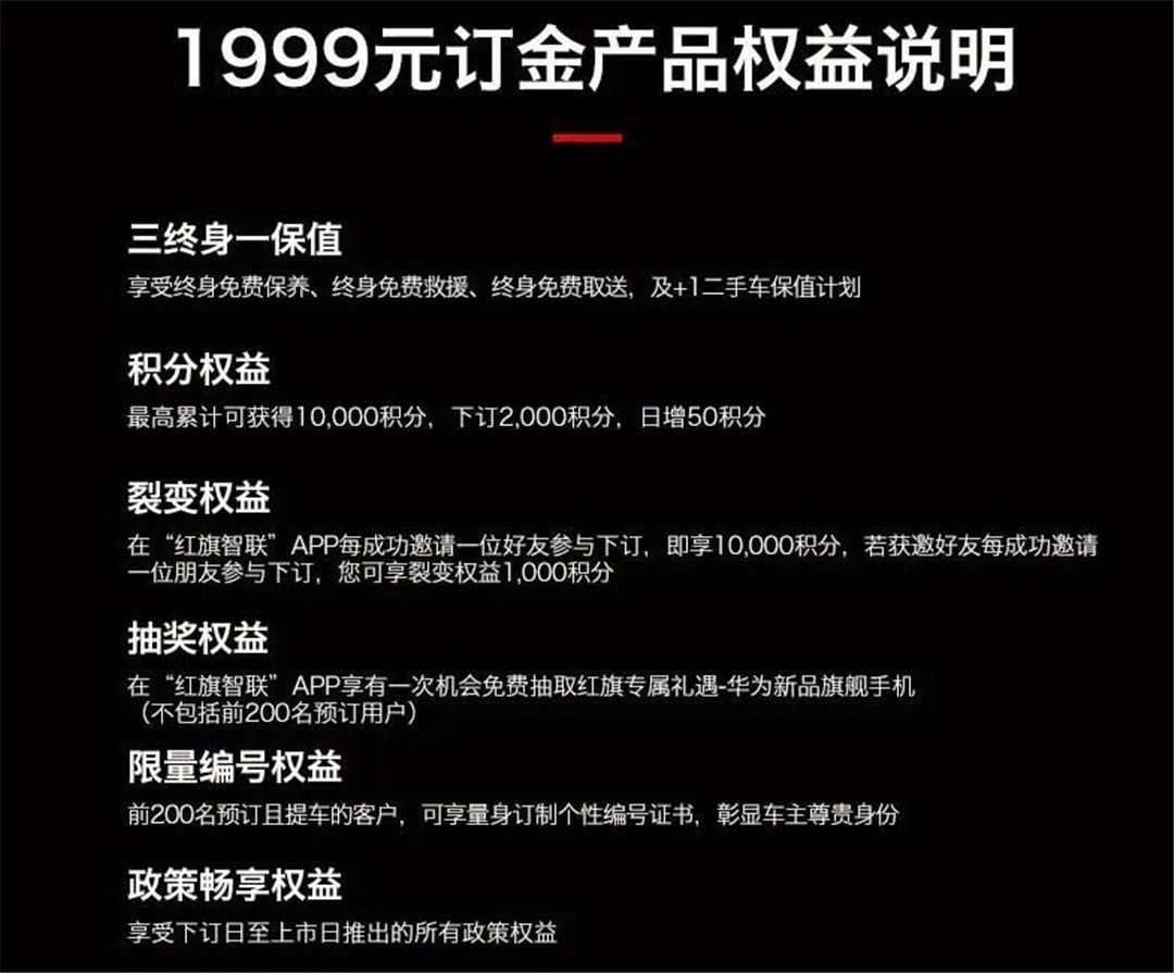 在今年的3月7日,新红旗H9已正式开启预售,活动一经开展便吸引众多消费者的关注。消费者可以登陆红旗智联APP或天猫一汽红旗官方旗舰店交付订金,共提供1999元和4999元两档订金政策,消费者在支付订金之后即可选择具体配置,已支付订金的消费者可享受优先提车的待遇,关于两档订金政策的权益具体如下。此外,新车将于今年六月正式上市,你们心动了吗?