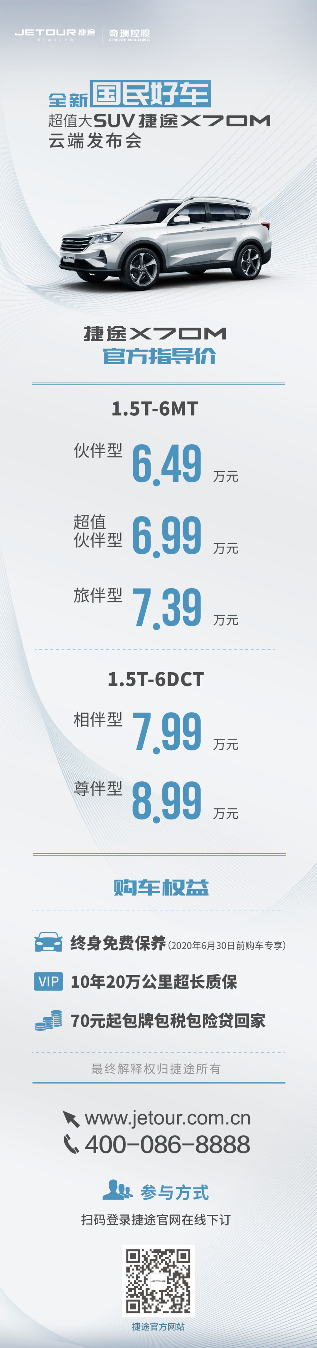 至于X70M的定位,你则可以理解为是X70这个系列里的其中一款,这个系列共包括了X70、X70M、X70S、X70 Coupe,从目前的售价来看,最亲民的就是X70M这个车型了,起售价最高的则是X70 Coupe。值得提一下的是,捷途X70M提供10年或20万公里的质保,这一点是做得非常厚道。