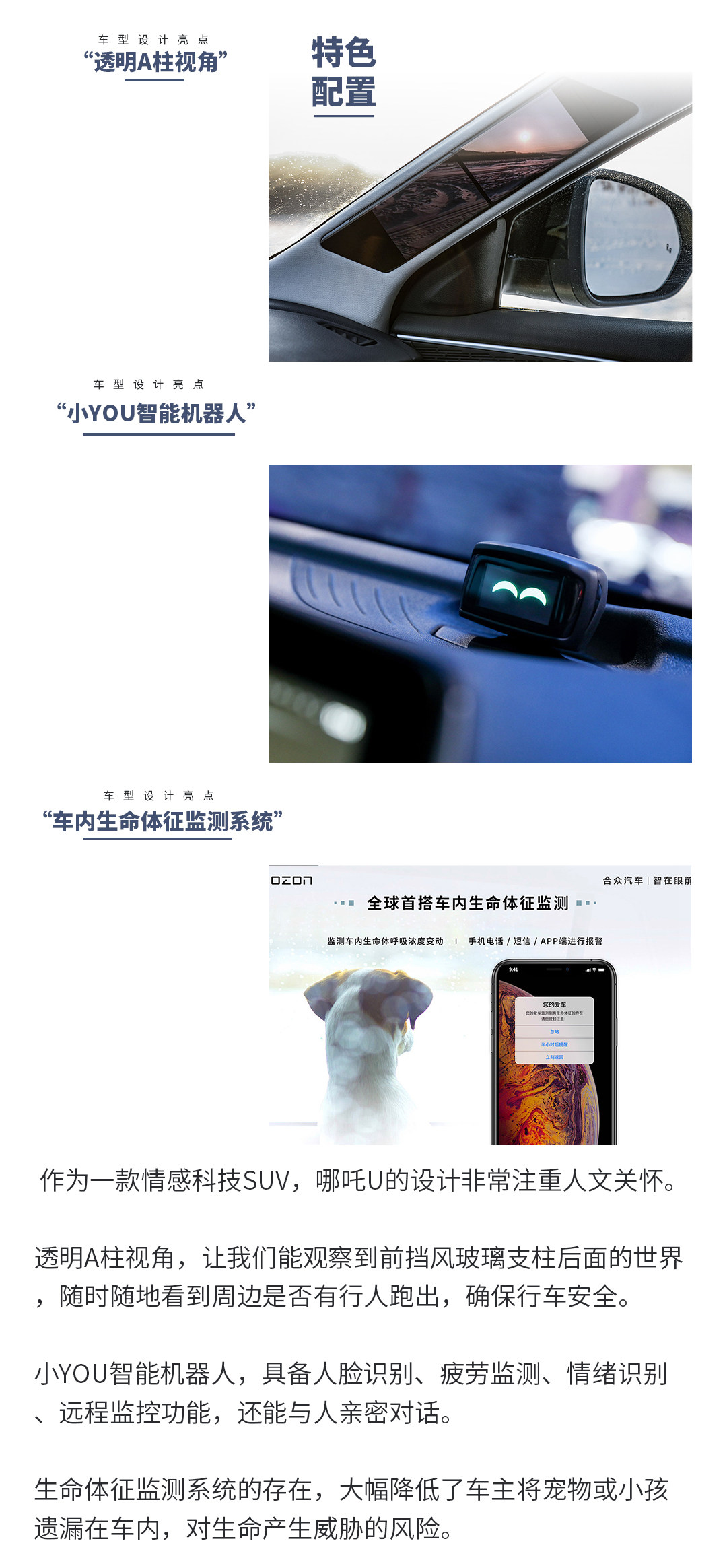 配置层面,倒车影像、胎压监测、泊车雷达、外后视镜加热等小白车主喜乐见闻的实用配置一应俱全。远不止此,在满足实用性的提前下,哪吒U还加入了生命体征检测系统、可视化透明A柱、小YOU智能机器人等充满科技感的配置。不过,遗憾的是可视化透明A柱需要进行选装。
