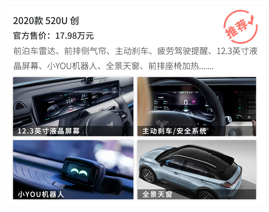 而520 U 创在400 U 创的前提下,加价3000元,就可以获得续航里程的上升,但在配置上有所缩水,譬如3D全景影像、行车记录仪、实体“小YOU”智能机器人等等。若对续航有更高要求,建议选择520 U 创版本。