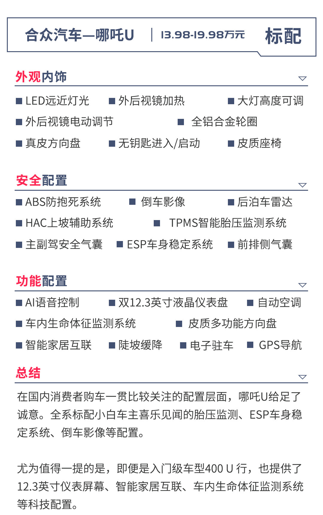 当然,如果对续航里程有比较高的要求,520版本车型当为首选。从性价比的角度考虑,400 U 享和520 U 享配置各方面差异都不大,也只是续航提升,但后者的价格要比前者足足贵了2.3万元。