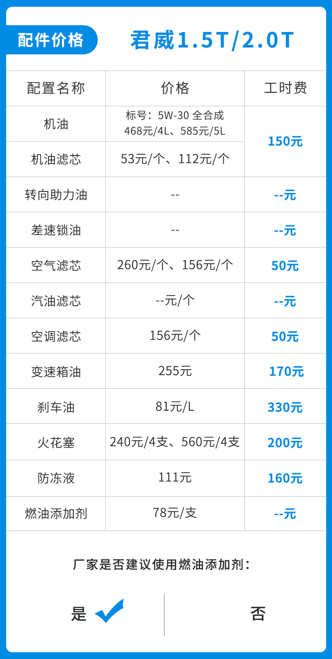 结合1.5T和2.0T两款车型,两者在保养上的差距并不算大,都是在100多到200多这个价格幅度,主要还是体现在上述说到的几个零配件差价上。