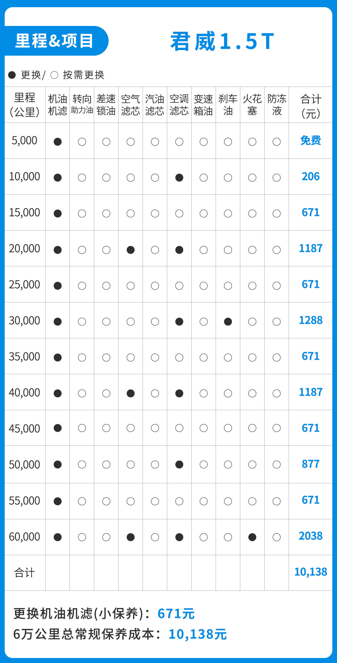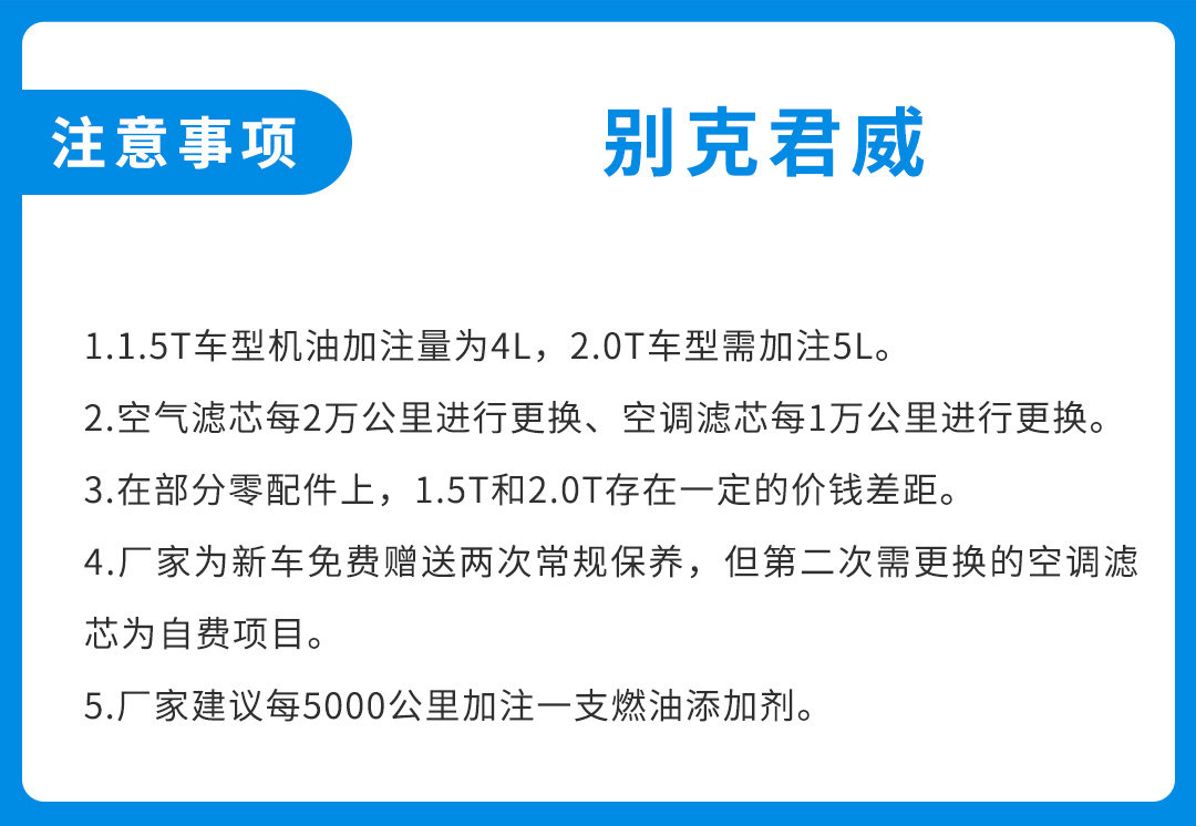 由于君威一共有两个动力选择,大致上是保养价格都是没有差别的,只是在机油用量、火花塞、空气滤芯和机油滤芯这几样略有差距。
