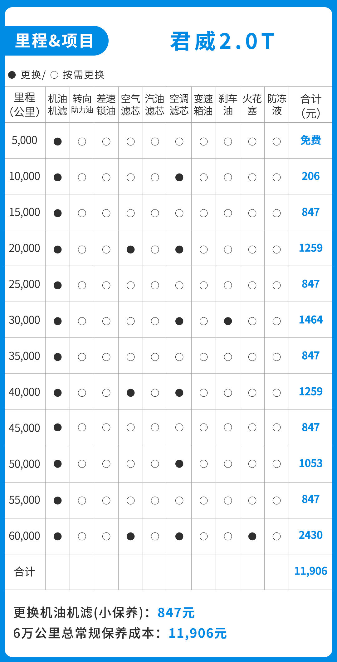 这里要注意的是,厂家会赠送两次常规保养,这里只包含了机油、机油滤芯以及工时费,但是按照保养手册的说明,第二次保养需要更换空调滤芯,那么这一点就需要自费了。