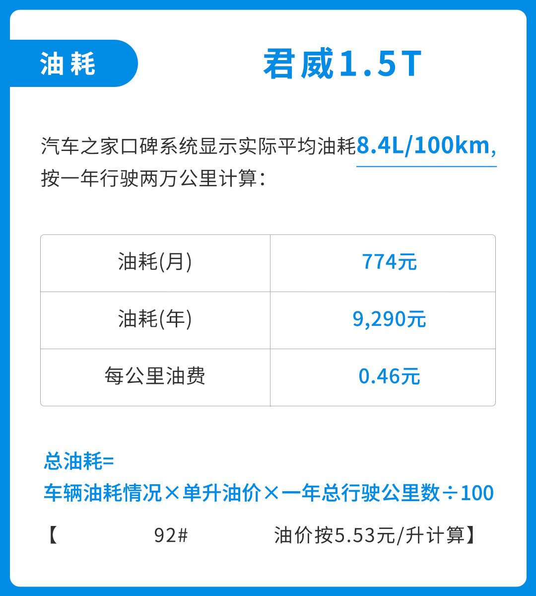 由于车型都集中在1.5T这个排量,我们就按1.5T的油耗来计算,由于目前的油价处于低位状态,一个月只要700多的油费对于一辆B级车来说还算是合理的,平均下来每公里只要0.46元,可以说基本和一辆A级车没有差别。