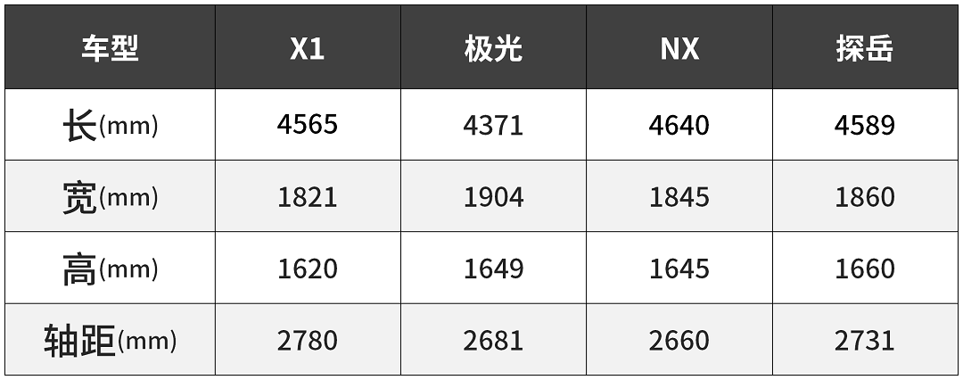 X1虽然是定位为紧凑型SUV,实际上它的尺寸比X2还要大,甚至跟一些中型SUV有的比,极光4371mm、雷克萨斯NX 4640mm、探岳 4589mm,所以不能只从定位级别入手去选车,还要看它的实际尺寸。