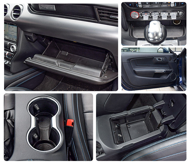 再一个就是Mustang的后备厢和储物空间,常规状态下纵深就有1米,放倒后排能扩展到1.7米,宽度也是足够的,就是高度不高,其实已经跟一些紧凑型车相差无几,在跑车里面可以说是相当能拉货了;再一个是储物空间,杯架、扶手箱、门板等等都有储物格,数量和大小都还不错。
