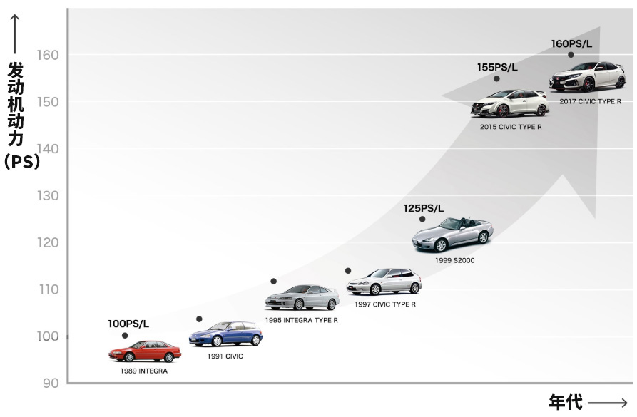这从历代本田生产的性能车便可看出端倪,在运动文化的引导下,你会发现它们的发动机性能都很强大,尤其体现在马力上。如果以每升排量所产生的马力为评价指标,那么巅峰时期,本田S2000的发动机已经达到了125Ps/L。我们拿2020年的民用自吸发动机对比,升马力最高的目前也只有87Ps/L,可见本田自吸发动机动力有多牛。
