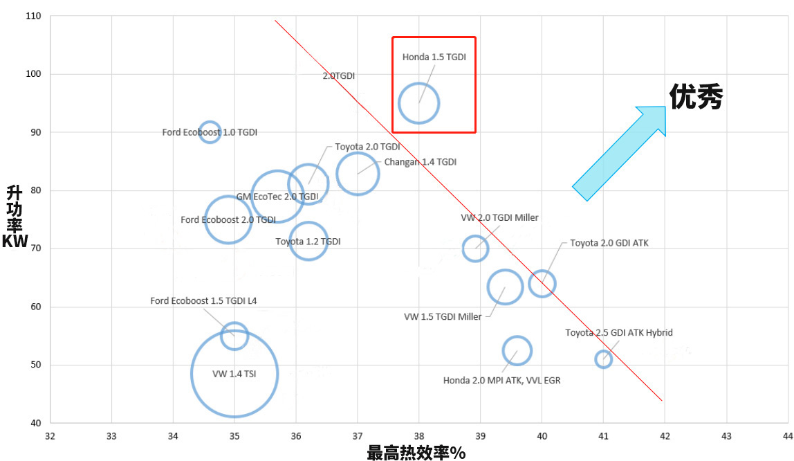 如果把目前主流的发动机功率与热效率汇成一张图,会发现大家其实都是一个水平,只不过是看谁更倚重效率或者动力。而本田1.5T地球梦发动机是一个例外,它的升功率和热效率均在行业主流水平(上图红线)之上。