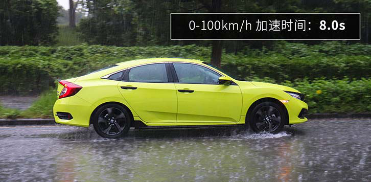 教授之前在测试思域时突遇大雨,令人感到意外的是,湿地恶劣路况,思域百公里加速时间刚好是8秒整,换做干燥路面它可以轻松跑进7秒俱乐部,这样的成绩已经远超同级了,可以肯定是,思域的动力性能在同价位中难寻对手。