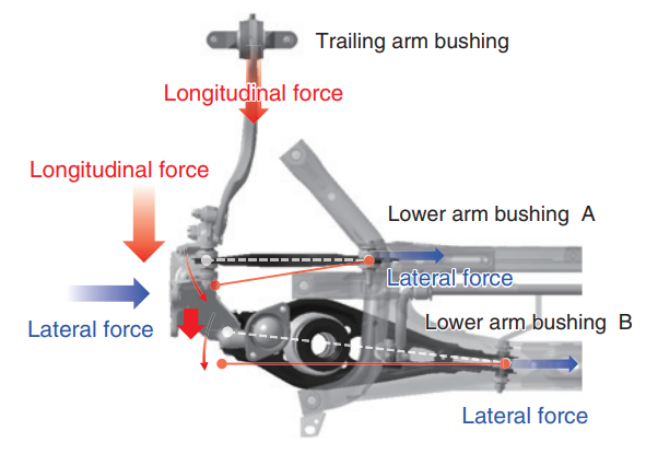 悬架侧向刚性跟舒适没有多大关系,要让悬架变的舒适运动,那么该硬的地方要硬该软的要软。于是本田优化了思域后悬架纵壁,让纵壁单独承当纵向力。因为后悬把纵向和侧向两个力分开了,纵向使用低刚性衬套,而侧向使用高刚性衬套,这样舒适和运动就两不误。