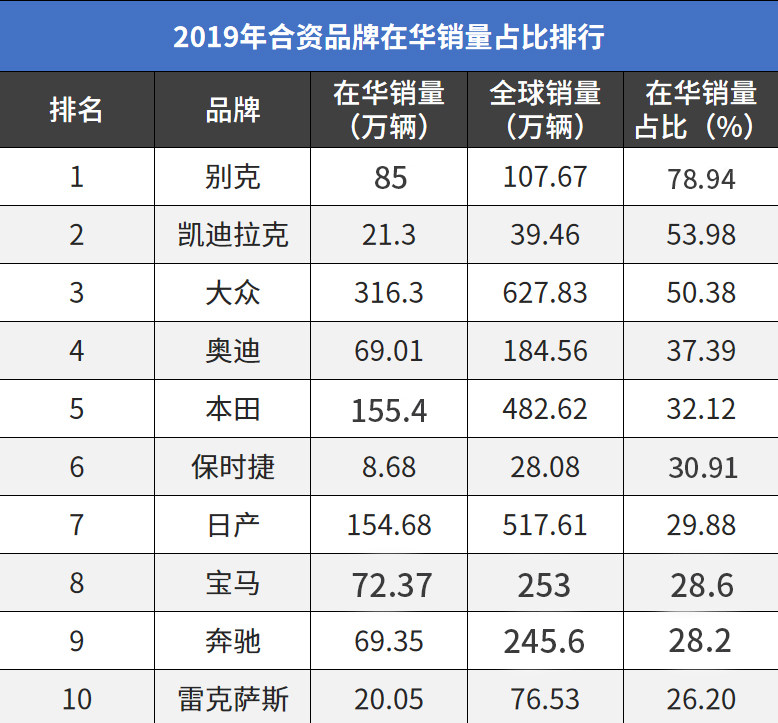 说好的“世界的丰田,中国的大众”呢?怎么“对华依赖症”最严重的不是大众?是不是中间出了差错?其实今年并非别克第一次占领”对华依赖榜单’的冠军宝座,实际上别克几乎对冠军形成了垄断。2019 年别克在全球范围内共卖出 107.67 万辆,其中在华销量高达85万辆,占比将近八成。别克在中国市场的任何一个细微的动作,都有可能引发整个品牌的连锁反应,可谓牵一发而动全身。