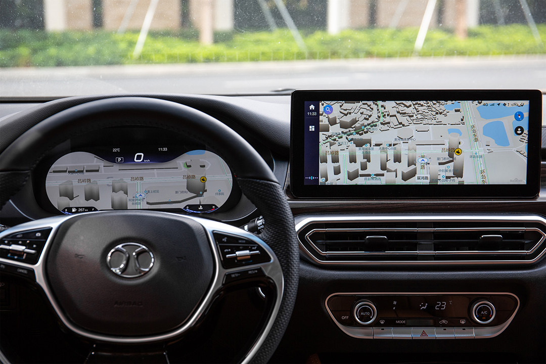 内饰做工质感相比D70有一定提升,但更有意思的是,为凸显“智能”效果,BEIJING-U7采用了两块12.3英寸的液晶屏幕,分别担任仪表盘和中控多媒体触控角色,后者集语音交互、车载互联系统一体,科技感和实用性两相宜。