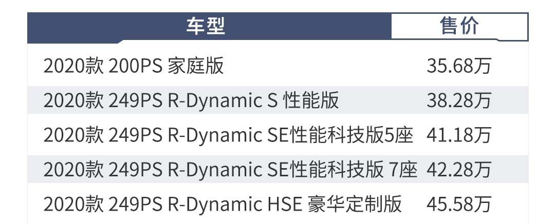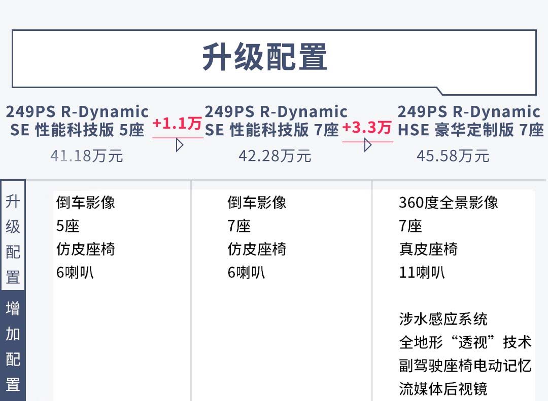 至于7座版本,249PS R-Dynamic SE 性能科技版5座和249PS R-Dynamic SE 性能科技版7座在配置上相差不大,而至于顶配车型,就拥有了涉水感应系统、全地形“透视”技术等高逼格配置,并且座椅也升级为真皮的,喇叭增加到11个,对于追求舒适和豪华的消费者来说,可以考虑。