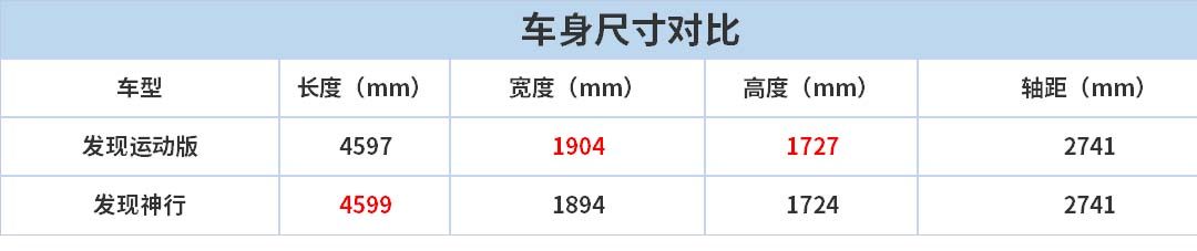 新车的长宽高分别为4597mm×1904mm×1727mm,轴距为2741mm,和发现神行相比,变化不大。座椅依然提供5座和7座布局。