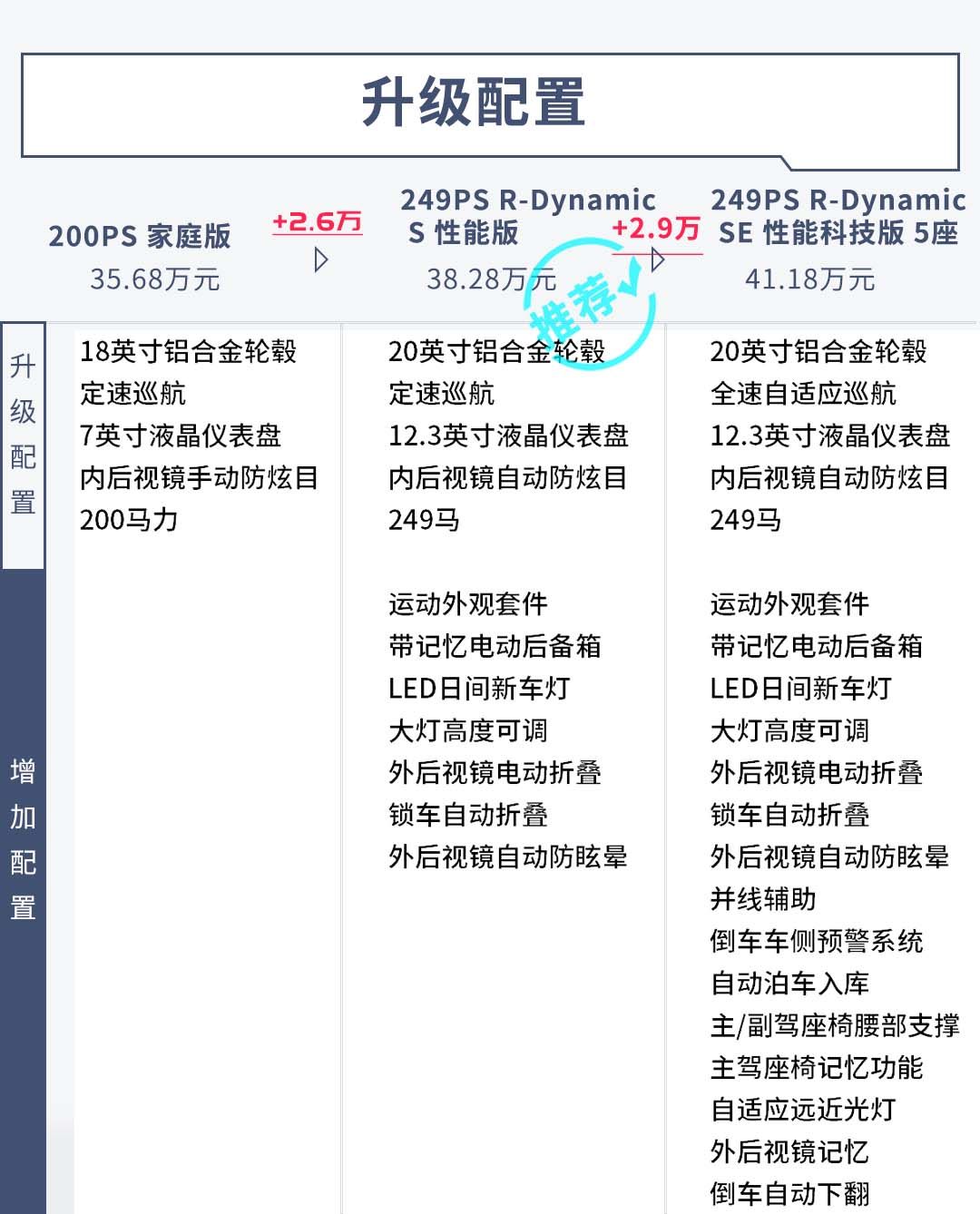 而售价41.18万元的249PS R-Dynamic SE性能科技版,相比249PS R-Dynamic S 性能版主要增加了全速自适应巡航系统和一些舒适性配置,但为此要多付出2.9万元,在买买君看来并不划算,因为249PS R-Dynamic S 性能版已经拥有了定速巡航、主动刹车系统、车道保持系统,道路标志识别功能,体验上和自适应巡航系统差别已经不大。