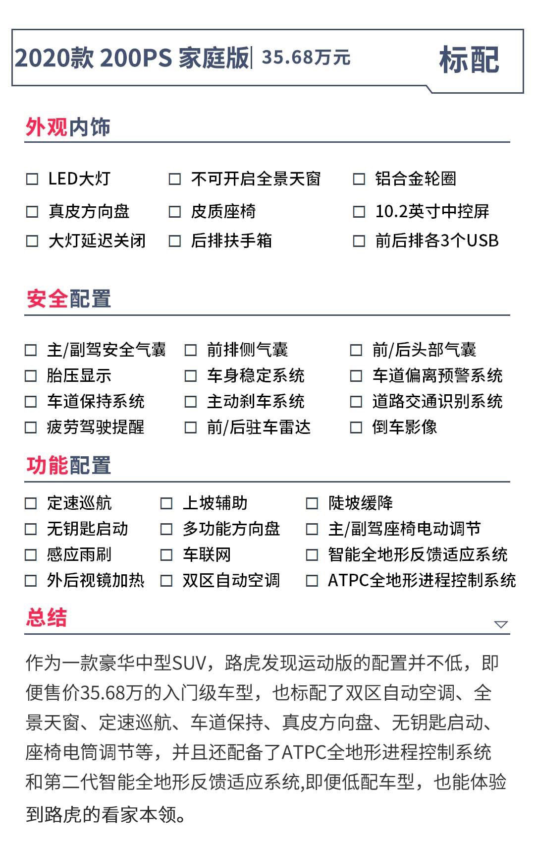 如果你的预算不足,对动力要求相对没有那么高,那么售价35.68万元的200PS 家庭版车型同样值得推荐,即便入门版车型,也配了双区自动空调、全景天窗、定速巡航、车道保持、真皮方向盘等,并且还配备了ATPC全地形进程控制系统和第二代智能全地形反馈适应系统,体验上并没有打多少折扣。