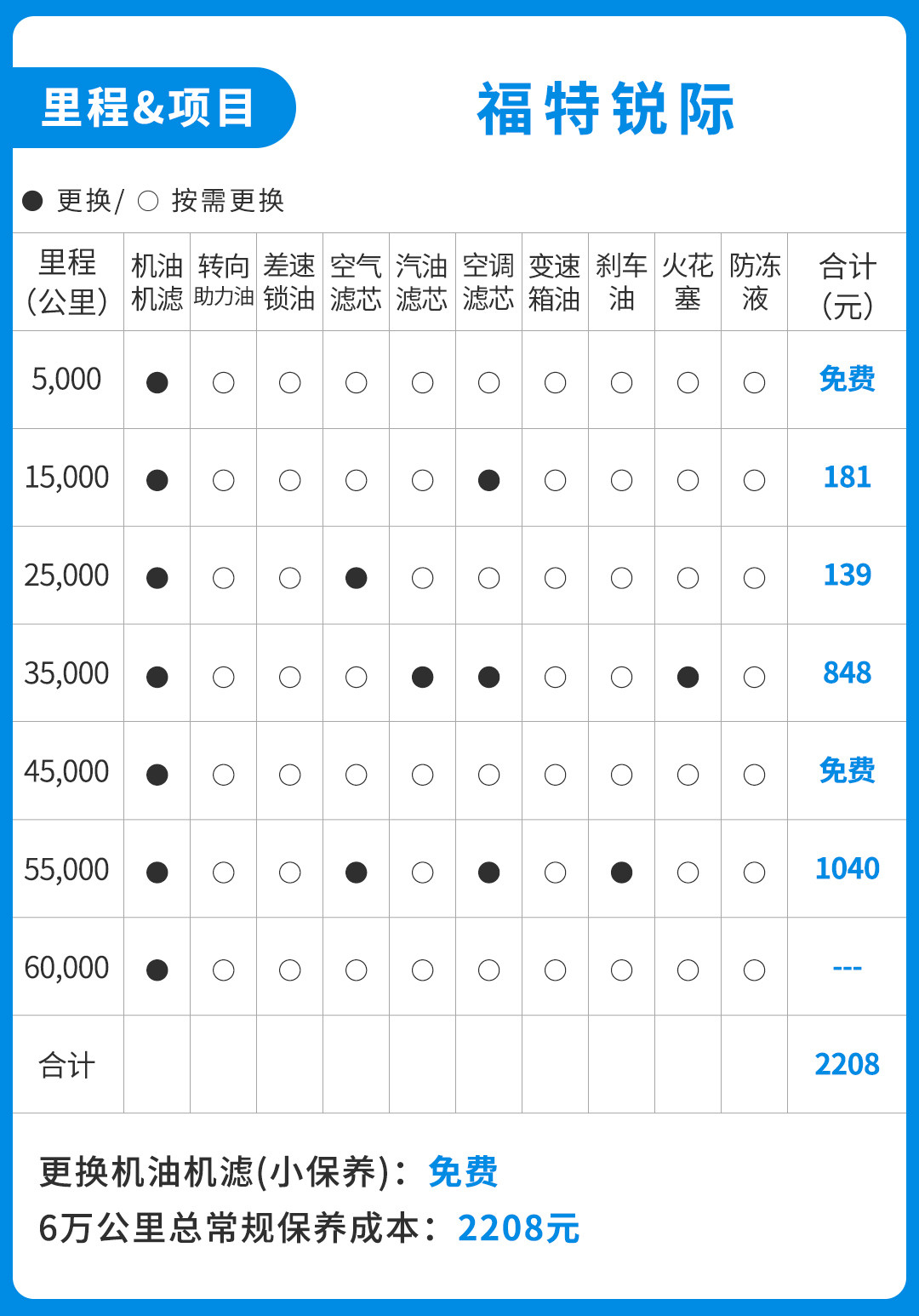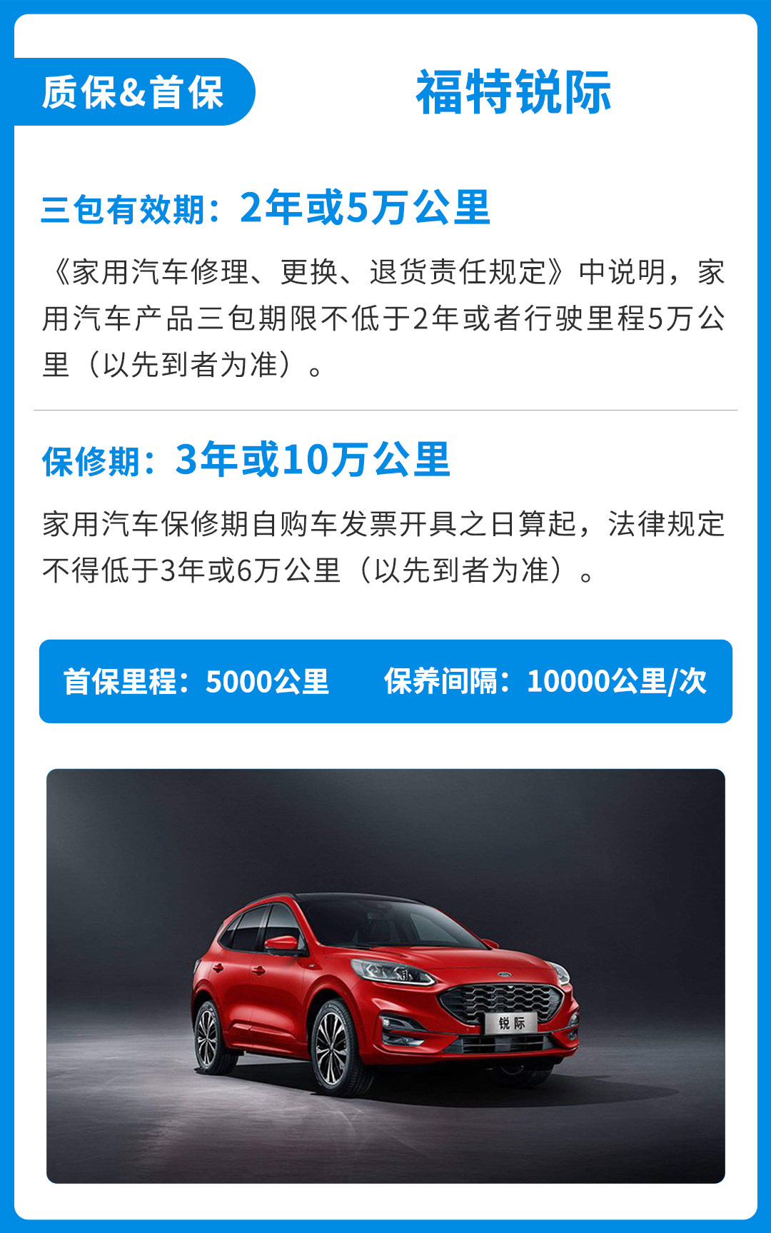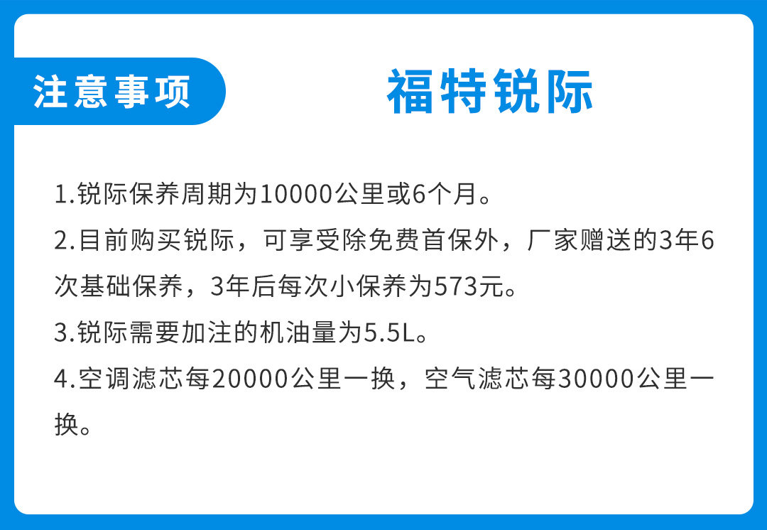 和大部分福特车型一样,锐际同样是在5000公里的时候需要进行首保,在每10000公里或半年的时候需要进行常规保养。
