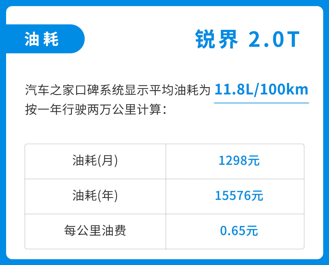 有着不错的空间和不错的舒适性,但锐界最大的问题还是在于其油耗,在2.0T顶配已经重达2吨的情况下,还有着245匹马力加持下的锐界,百公里油耗也去到了11.8L/100km。相比于途观L这类的低油耗代表,锐界的百公里油耗要高上3L左右。