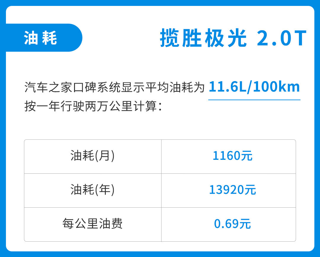 尽管尺寸有限,但大车重之下,揽胜极光的油耗也并非等闲之辈。高达11.6L/100km的百公里油耗,比起奥迪Q5L、宝马X3要高出不少。而由于采用95标号汽油,揽胜极光的每公里油价还是高达0.69元,但比起此前每公里一员的油价,已经有了不小的进步。