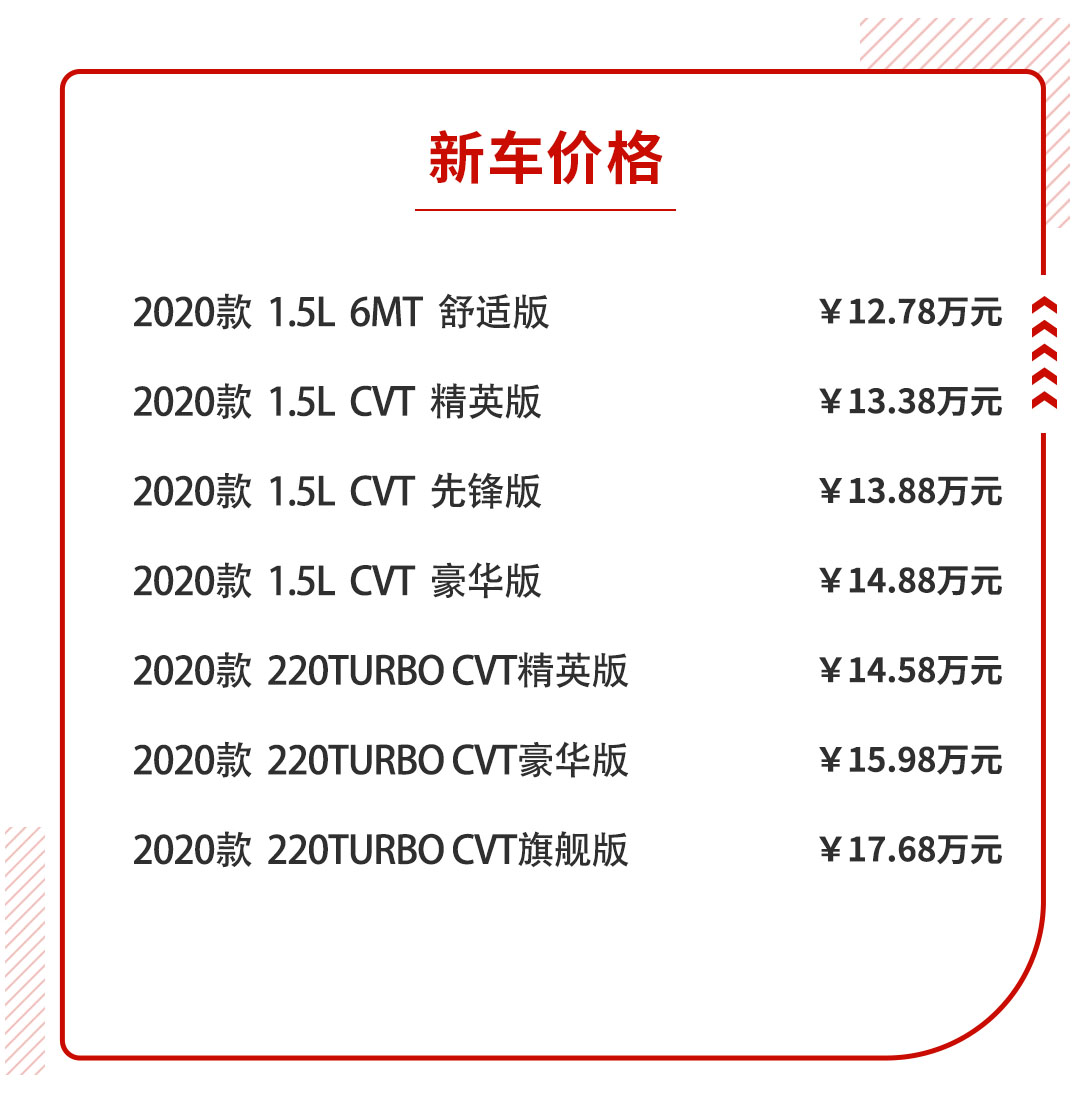 2020款缤智属于年度改款共推出7款车型,动力继续提供1.5L/220TURBO(1.5T)两种选择,其中1.5L车型起售价为12.78万元,1.5T车型起售价为14.58万元。