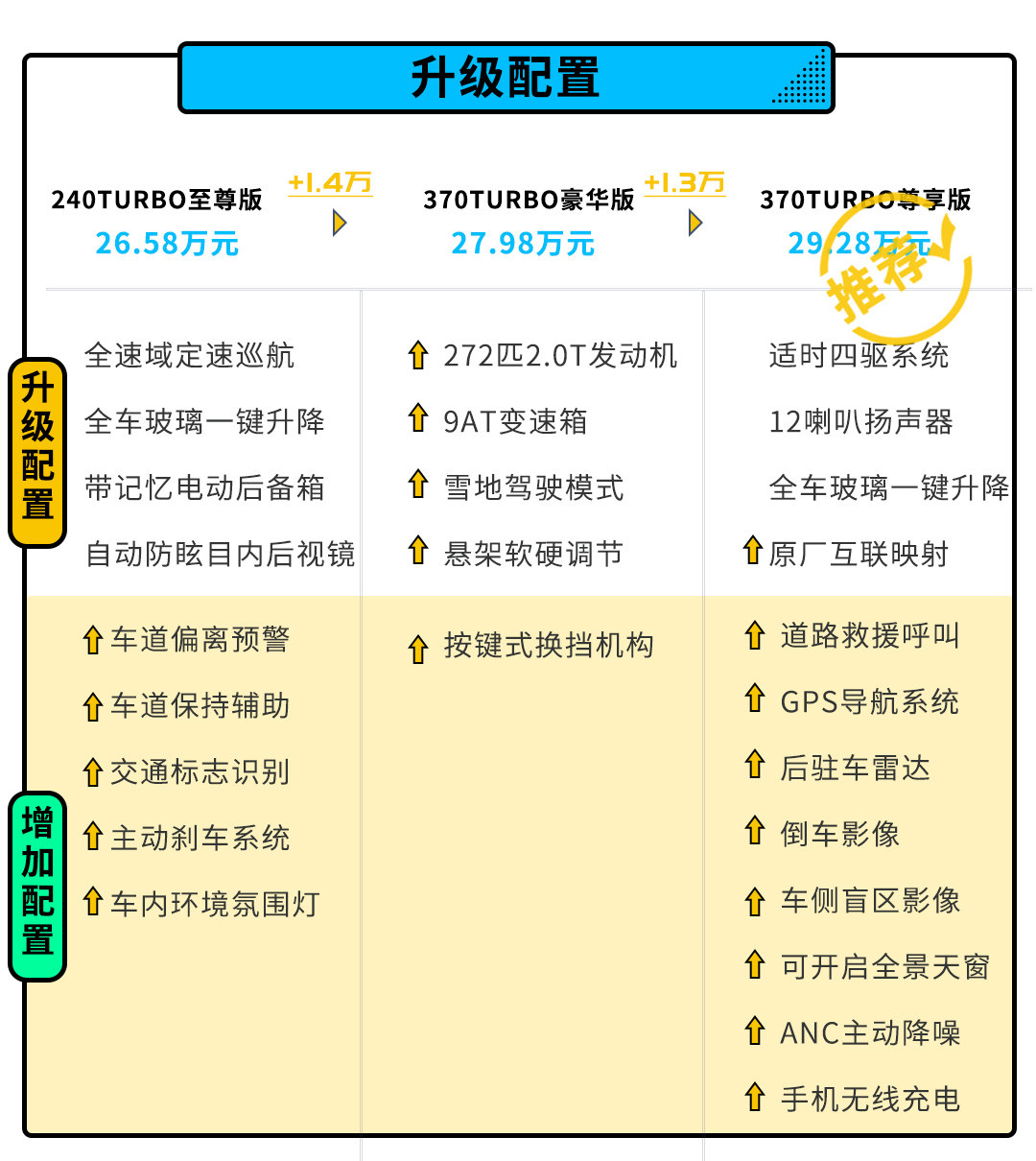 再往上加1.4万,主要能获得2.0T发动机和9AT变速箱,还有就是雪地模式等等,但是对于内在来说丧失了非常多的配置,这一点是比较不值得的。再说了,没有四驱系统的雪地模式,你觉得有灵魂吗?