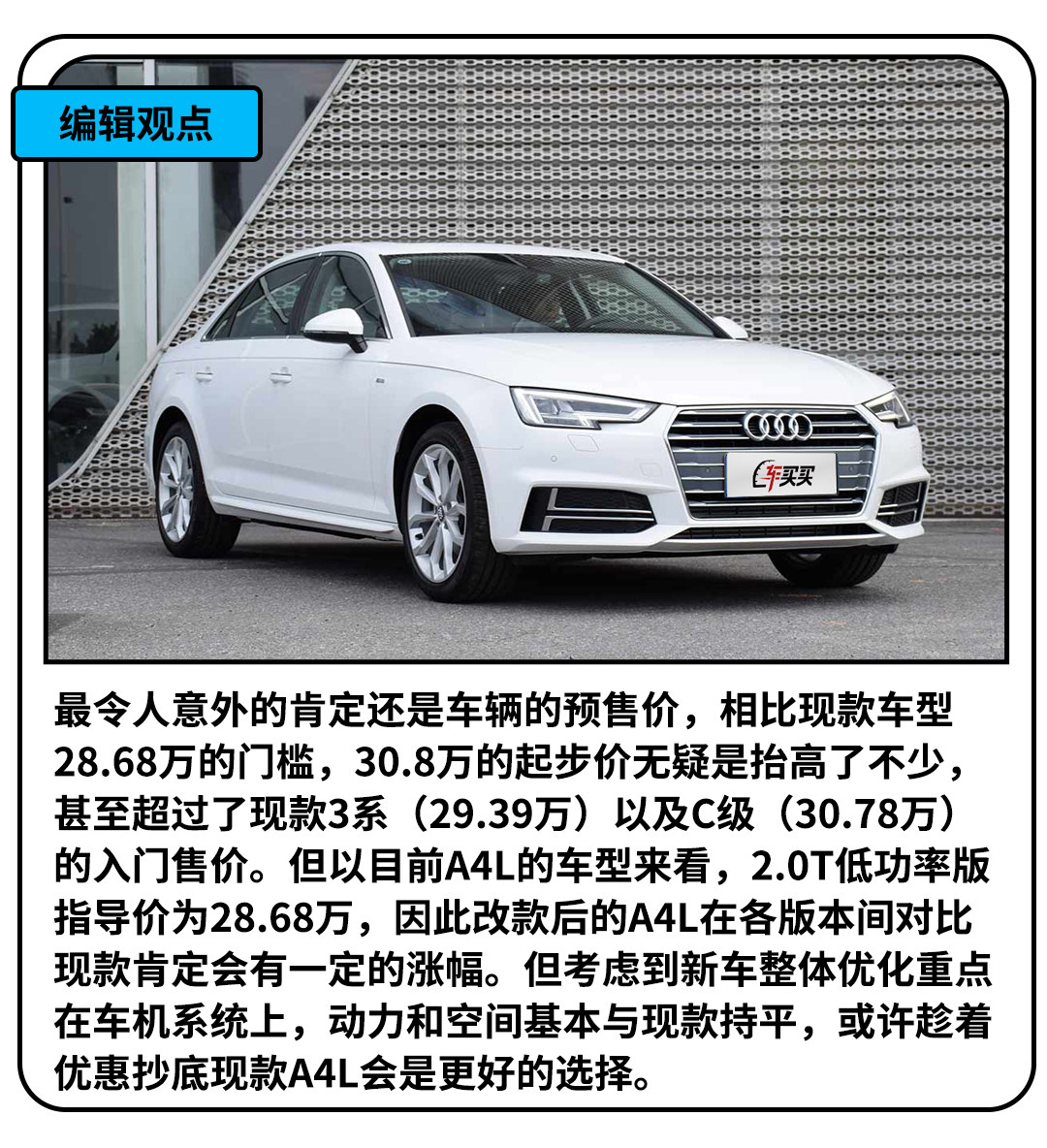 前段时间我们报道过中期改款奥迪A4L试车到店的消息,而近期官方也放出消息称全新车型将于4月10日上市,预售价区间为30.80-40.00万元。新车在车身尺寸与轴距上相比改款前的A4L并无太大区别,但全新A4L搭载S-line运动套件的车身设计相较现款运动版更具攻击性,且内饰也会提供不同于普通版的配色选择。而动力方面,改款后的A4L将舍弃1.4T的入门动力,转为提供最大功率150Ps、190Ps和252Ps三种2.0T动力方案。