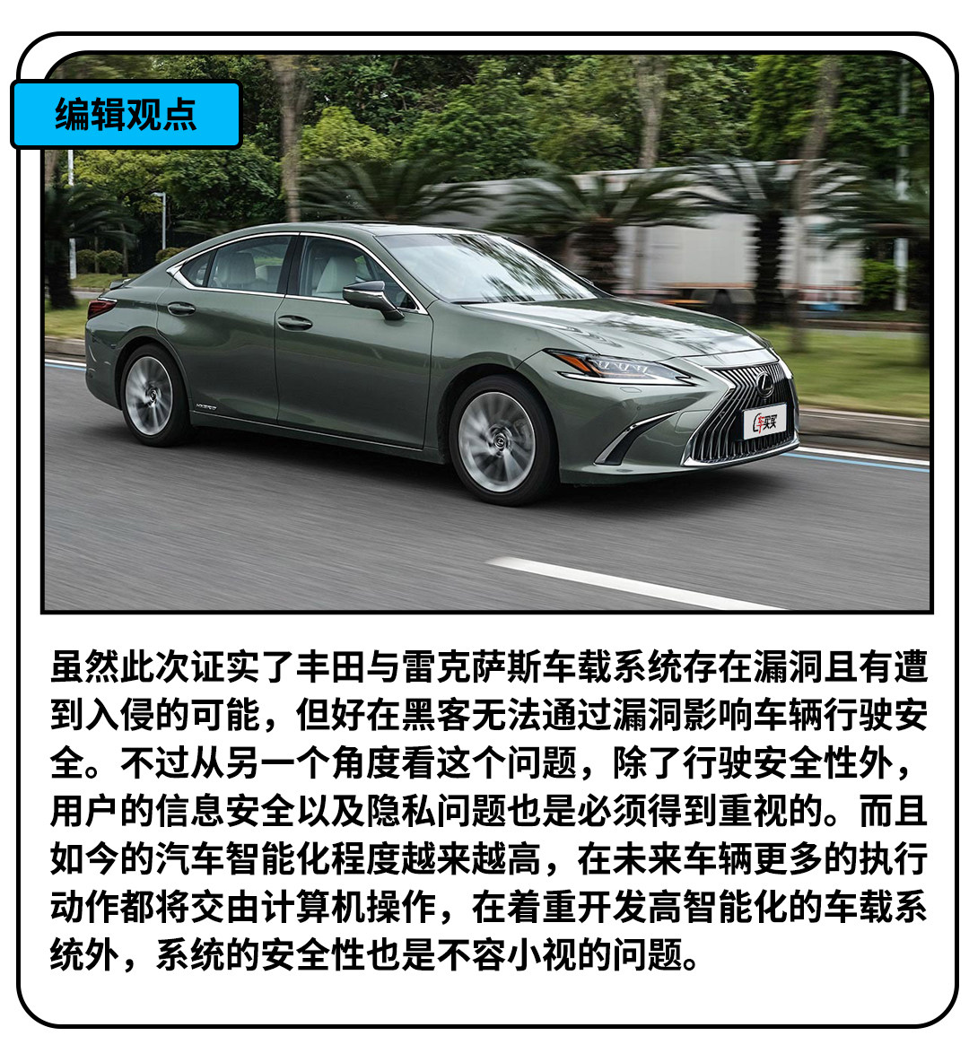 日前,科恩实验室提供的相关信息指出,目前在售的部分雷克萨斯及丰田车型存在安全漏洞。而丰田也复制了这一测试,承认科恩实验室的信息准确性与真实性。黑客能够利用已识别的蓝牙安全漏洞运行部分车载功能,但这些安全漏洞无法控制车辆方向盘、制动或油门踏板。目前丰田根据相关细节作出优化,车主只需升级软件,即可修补该安全漏洞。