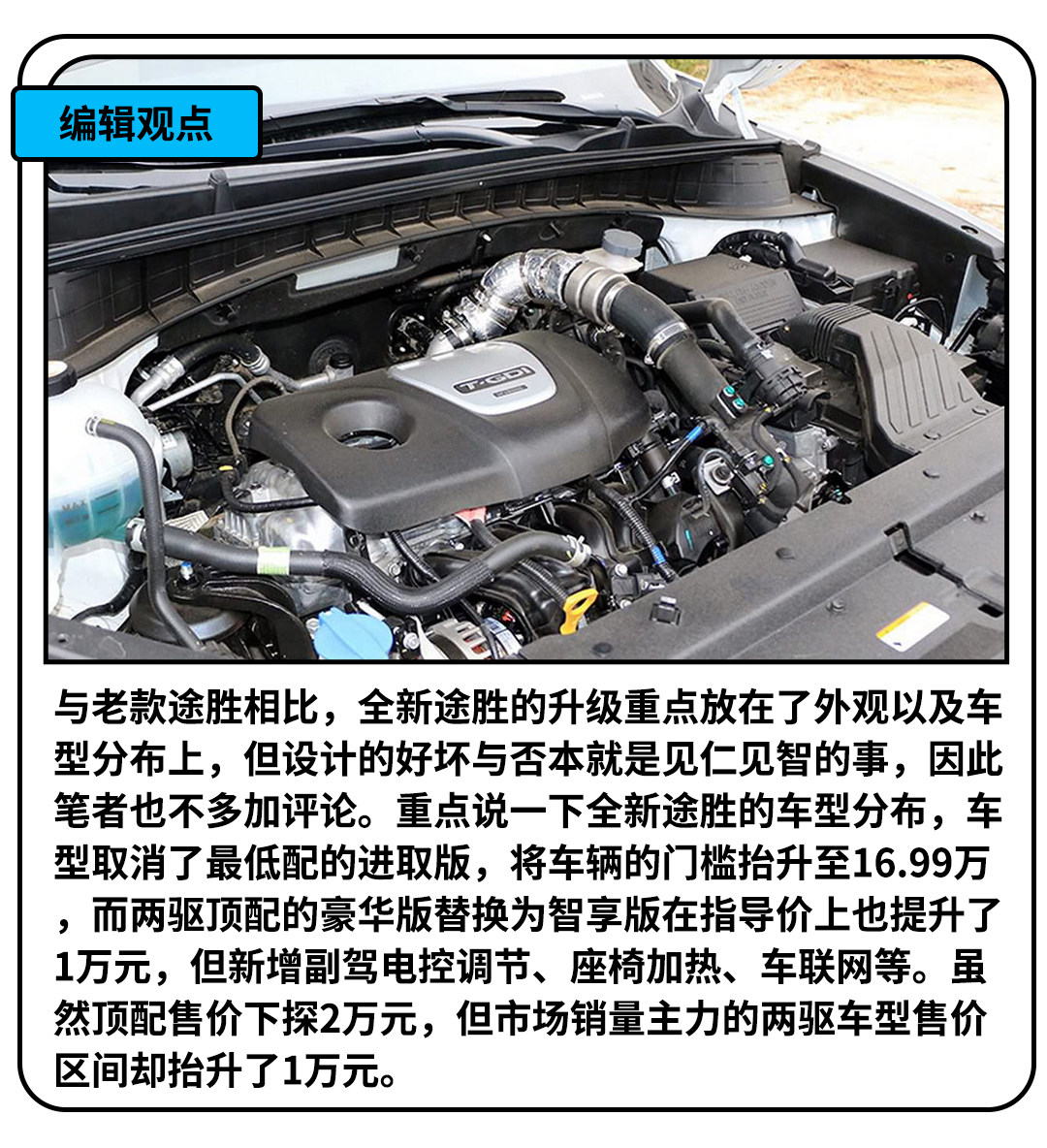 近日,北京现代宣布新款途胜正式上市,车辆售价区间为16.99-21.99万。相比现款,新款途胜对车型设计进行了重新设计,并且新车取消了原有的进取版和豪华版,追加了一款智享版车型。内饰和车身尺寸则与老款维持一致,动力方面则继续搭载1.6T+7DCT的动力总成。