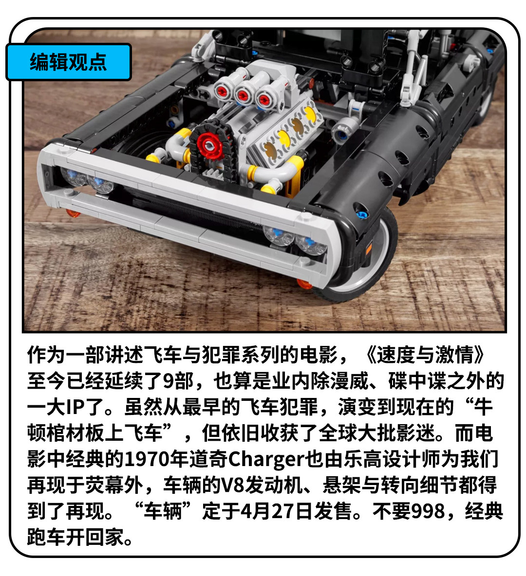 由于疫情在全球范围的影响,小到电影,大到车展、赛事都遭到了延期。原本定于今年上映的《速度与激情9》也毫无意外地延期了,但乐高却为影迷朋友们带来了好消息,近期将发售《速度与激情》中经典跑车道奇Charger的拼装模型。这款积木共有1077块零件,车身长宽高为390/160/110mm,并且能够实现发动机与车轮联动的细节,悬架细节也在模型中得以还原。而这款道奇Charger的售价为99.99美元(约合人民币708元)。