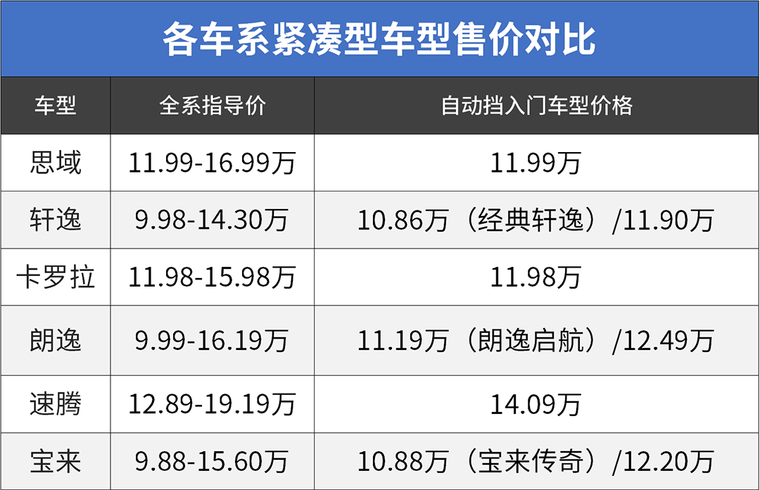 以大众为例,目前大众紧凑型车的自动挡起售价均超过12万元,而日系的卡罗拉和轩逸均在12万以内(朗逸启航和宝来传奇属于上一代车型不算入内),其中思域卡罗拉已经全系配备自动挡,而德系依然是手动挡车型作为低配;而速腾的自动挡车型起售价也是高达14.09万元,这样的价格逼近中型车雪佛兰迈锐宝XL(指导价15.49万起)。