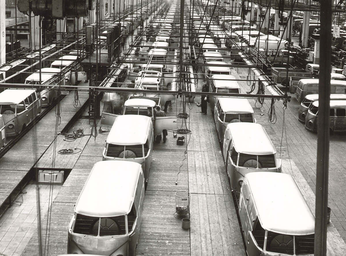 第一代Transporter于1949年亮相其概念车,并在1950年正式推出,在当时分商用版、乘用版和8座小巴3种车型,采用与甲壳虫一样的后置后驱布局,搭载与甲壳虫一样的1.1L四缸风冷发动机,最大功率24马力,匹配与甲壳虫一样的变速箱。1951年,T1推出了之后最具代表性的Samba(森巴)车型,拥有折叠式天窗与全车多面玻璃窗。1956年,T1的生产线从沃尔夫斯堡移到汉诺威直至停产,根据统计,到1967年停产时,T1共售出大约190万辆,可以说是大获成功。然而,T1之后其实仍在生产,只不过是将生产线转移到巴西,直到1975年。