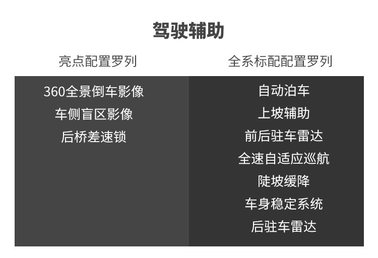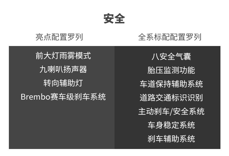 尤其是全系标配八安全气囊、车道偏离预警、交通标识识别功能、主动刹车/安全系统,这是很多同级车型难以做到的。
