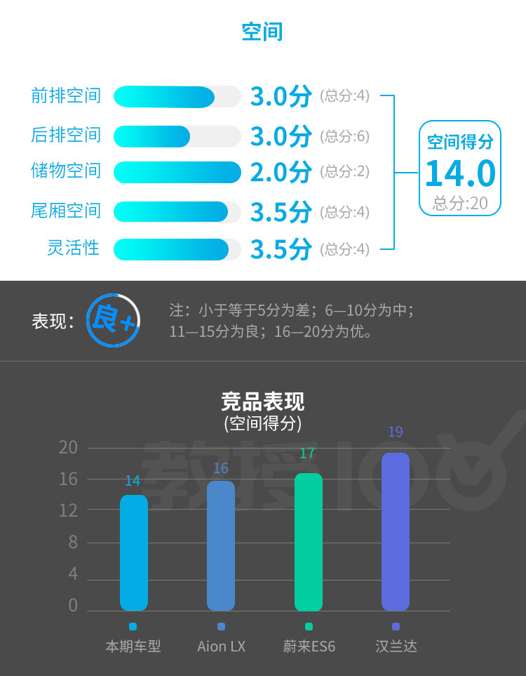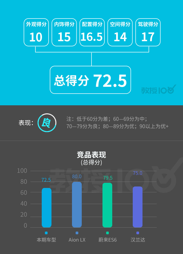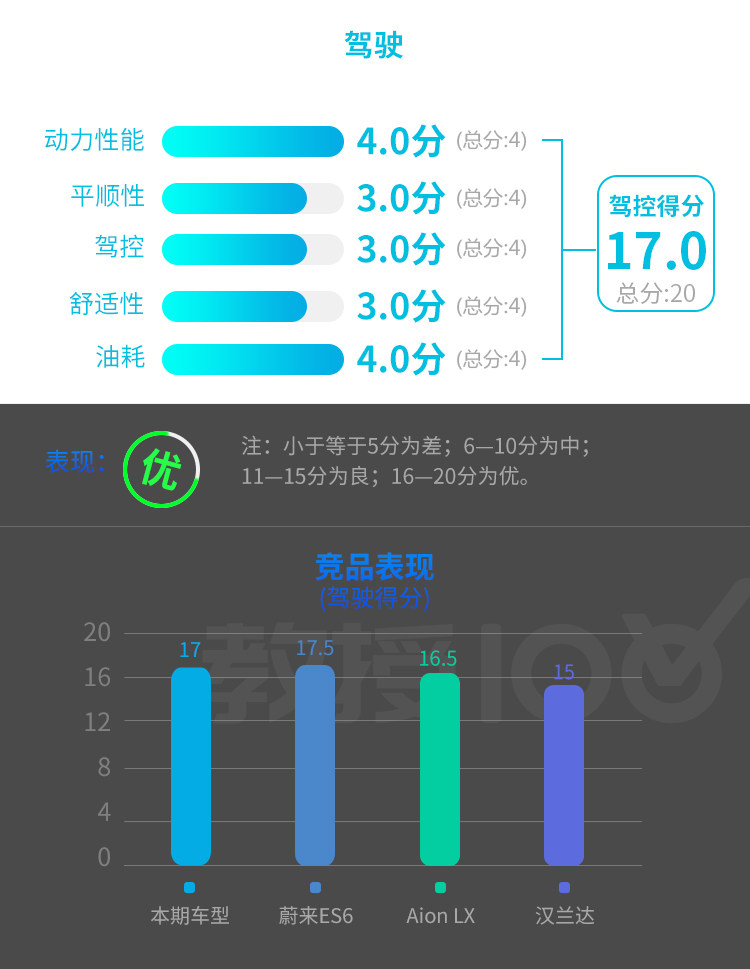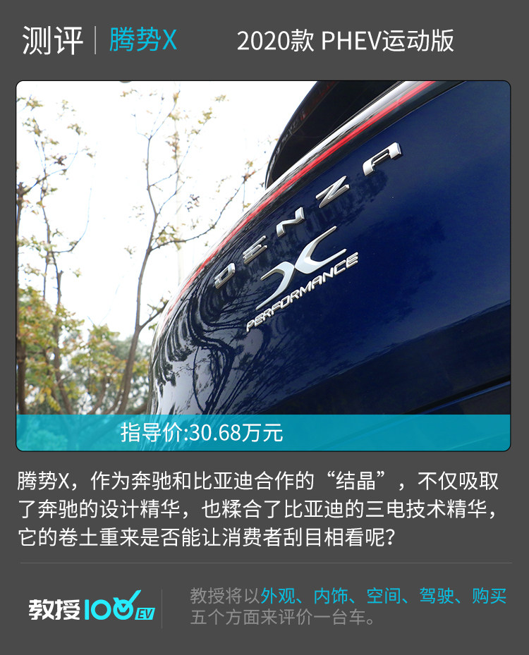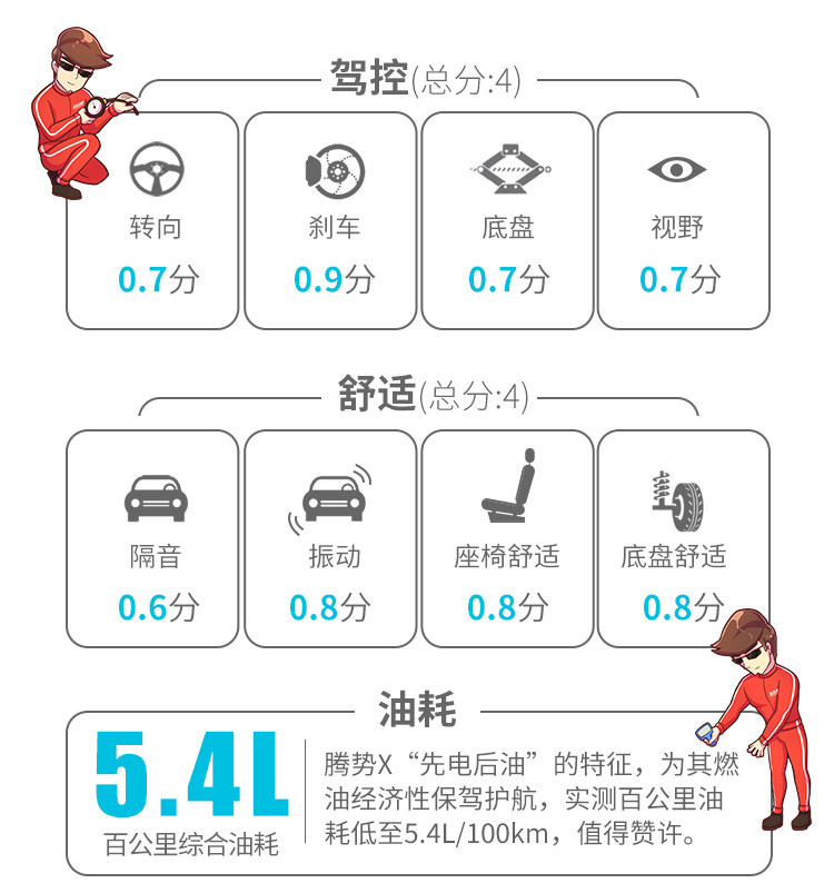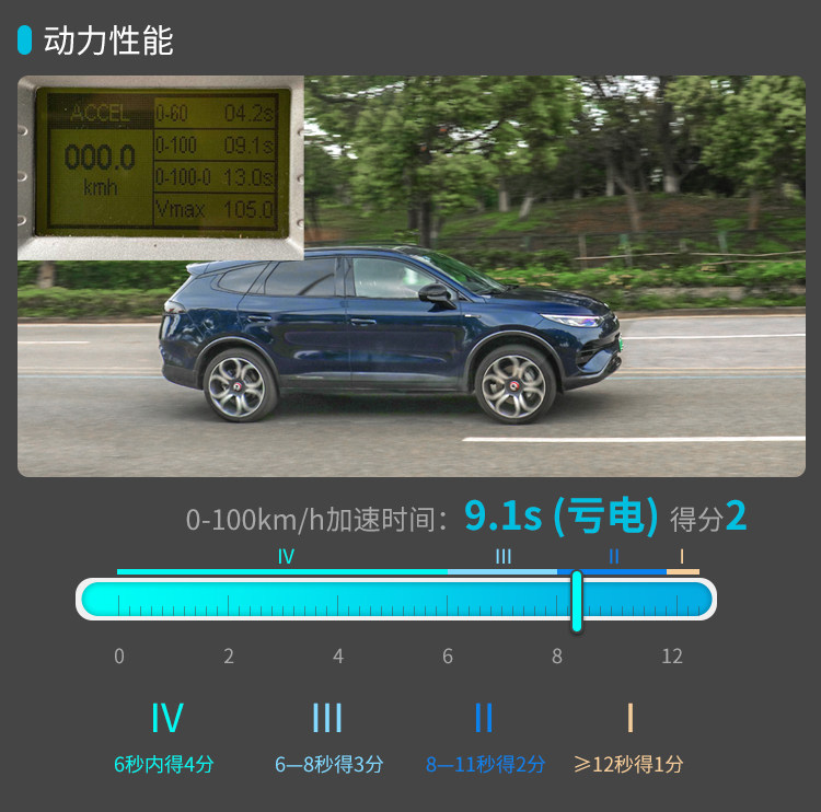 备注:因为亏电模式下,腾势X完成百公里加速成绩需要9.1s,表现比较一般,所以在加速测试这一细分项,教授只给了2分。但在电量充盈时,实际体验其动力爆发有劲,结合官方4.7s的加速成绩,在动力性能这个大层面 ,教授给予了满分4分。