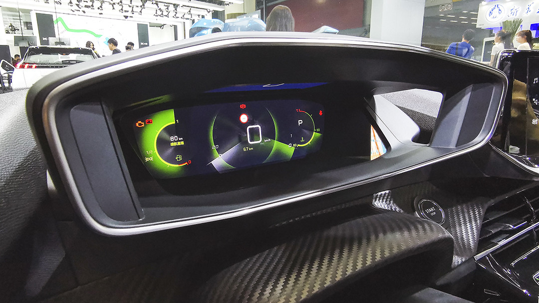这一块全新液晶仪表盘乍眼看上去并没有什么特别之处,但只需稍微转换观看角度就会发现,标致通过在仪表盘上方置入类似HUD抬头显示的装置,将车速、挡位、续航里程等数字信息投影至仪表盘玻璃表面,形成了独一无二的3D显示效果,带来极强的科技感。