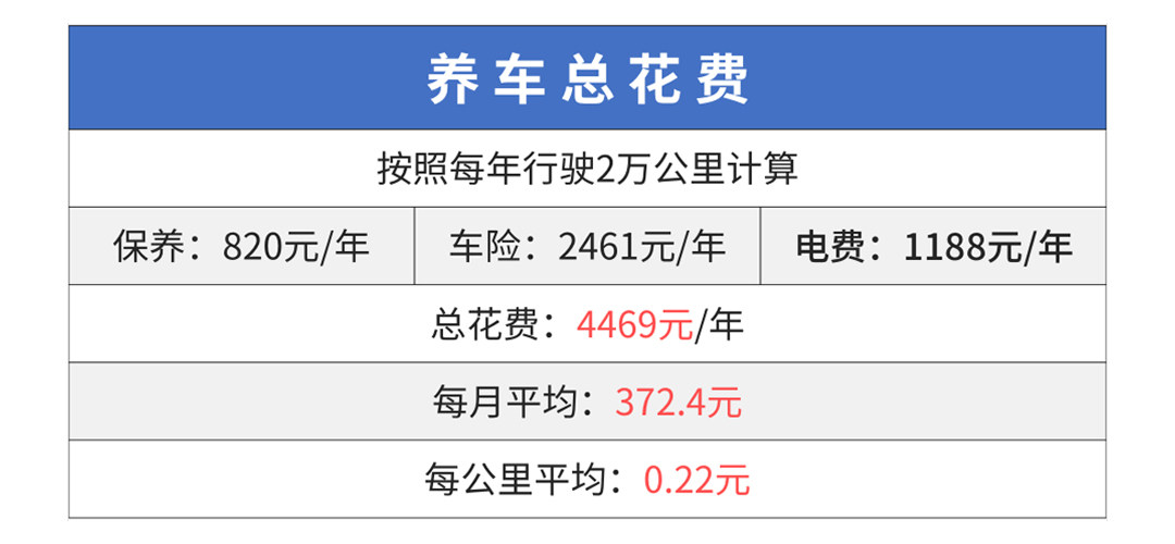 纯电车型本就有着使用成本偏低的优势,更何况是这类满足1~2人使用的纯电微型车。以eQ1的用车成本分析来看,车辆的保养周期为5000公里一次,包含常规检查在内的小保养费用是180元;一年的保险费也不多,仅2500左右。而占用车成本大头的油费自然不是eQ1要考虑的问题,按每年行驶2万公里算,车辆消耗的电费不足1200元。一年下来总用车成本约为4469元。