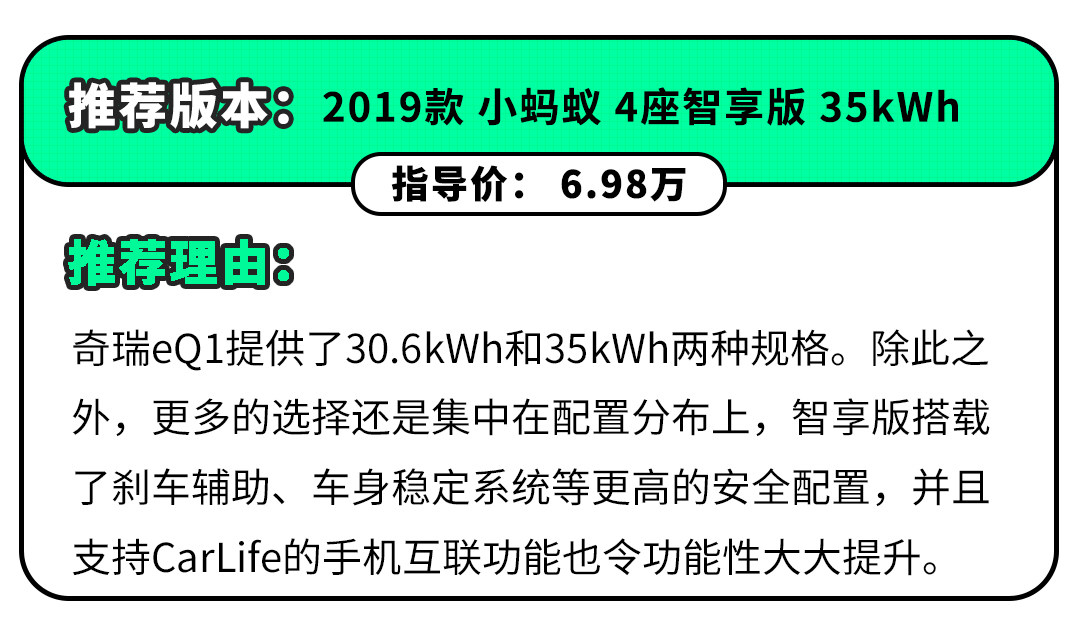作为纯电车型,续航肯定是消费者最关心的问题,eQ1的NEDC续航里程为301km,而在实际测试中,车辆的续航里程与NEDC标准基本相同,在同级别竞品中奇瑞eQ1的续航表现也能算是优秀。