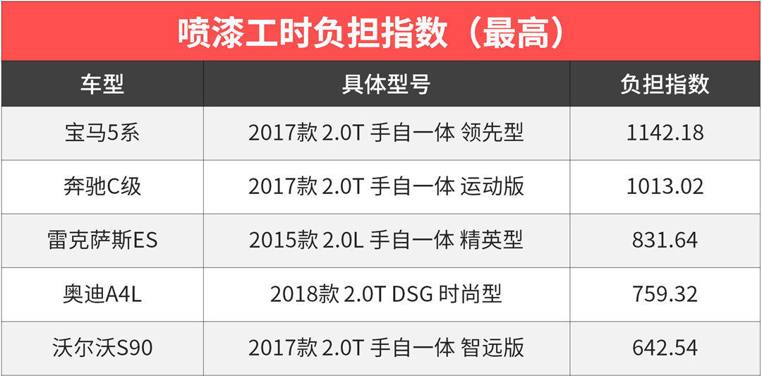 最后就是喷漆工时负担指数,指车辆13项单个覆盖件喷漆工时费用乘以覆盖件的损失率之和,再除以车辆13项单个覆盖件喷漆工时数乘以覆盖件损失率之和,得到的两者间比值。用来客观反映汽车消费者在车辆维修时喷漆工时成本负担情况,透明量化各车型之间的喷漆成本差异。同样由于车价之间存在的先天差异,所以喷漆工时负担指数最高和最低板块的前五名,均分别被豪华品牌车型以及普通品牌车型占据。